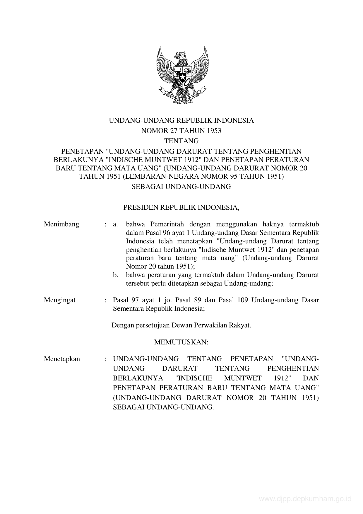 UU Nomor 27 Tahun 1953 | Undang-Undang Nomor 27 Tahun 1953 tentang PENETAPAN "UNDANG-UNDANG DARURAT TENTANG PENGHENTIAN BERLAKUNYA "INDISCHE MUNTWET 1912" DAN PENETAPAN PERATURAN BARU TENTANG MATA UANG" (UNDANG-UNDANG DARURAT NOMOR 20 TAHUN 1951 (LEMBARAN-NEGARA NOMOR 95 TAHUN 1951) SEBAGAI UNDANG-UNDANG