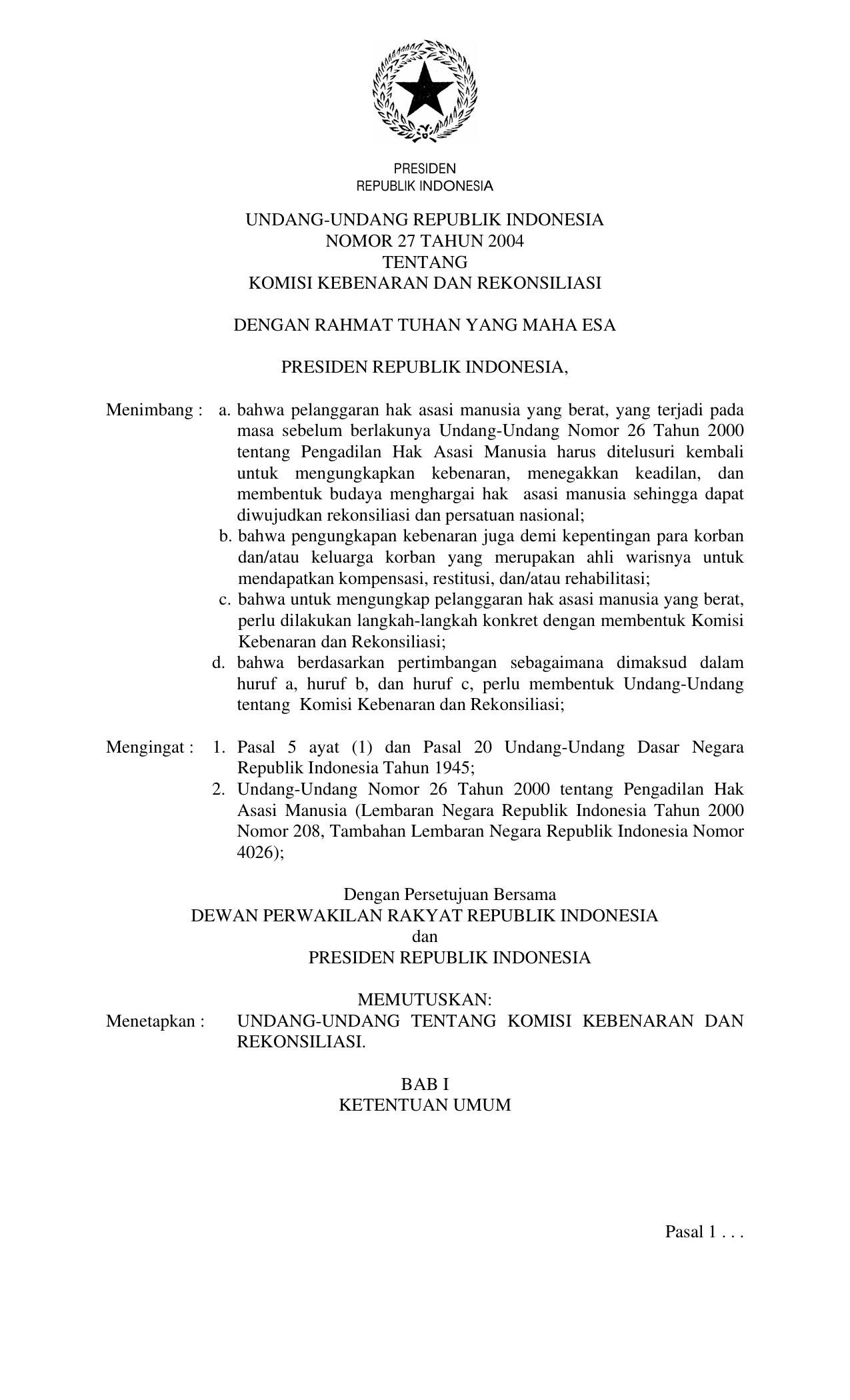 UU Nomor 27 Tahun 2004 | Undang-Undang Nomor 27 Tahun 2004 tentang KOMISI KEBENARAN DAN REKONSILIASI