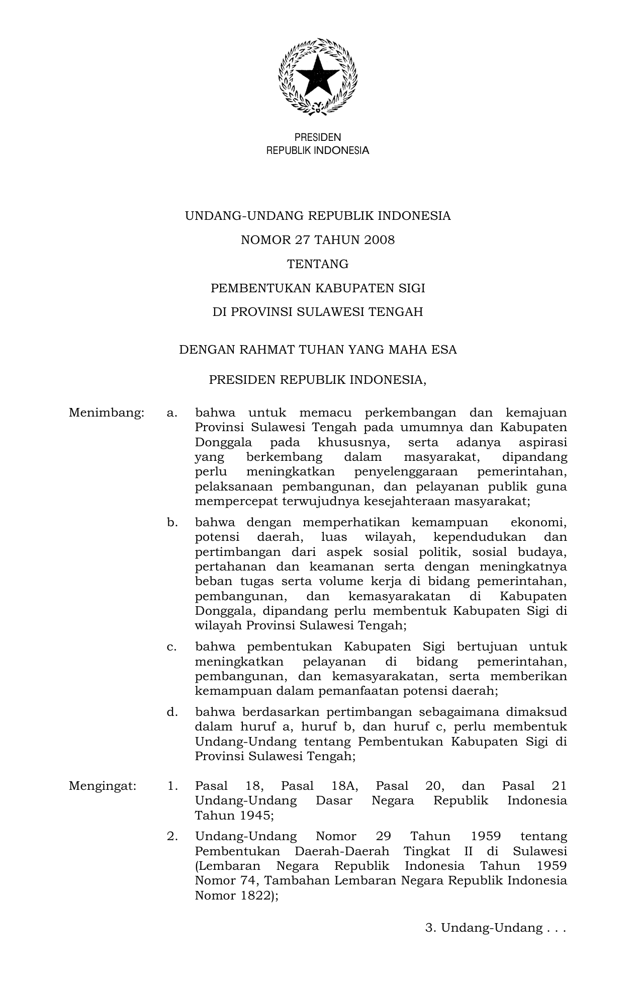 UU Nomor 27 Tahun 2008 | Undang-Undang Nomor 27 Tahun 2008 tentang PEMBENTUKAN KABUPATEN SIGI DI PROVINSI SULAWESI TENGAH