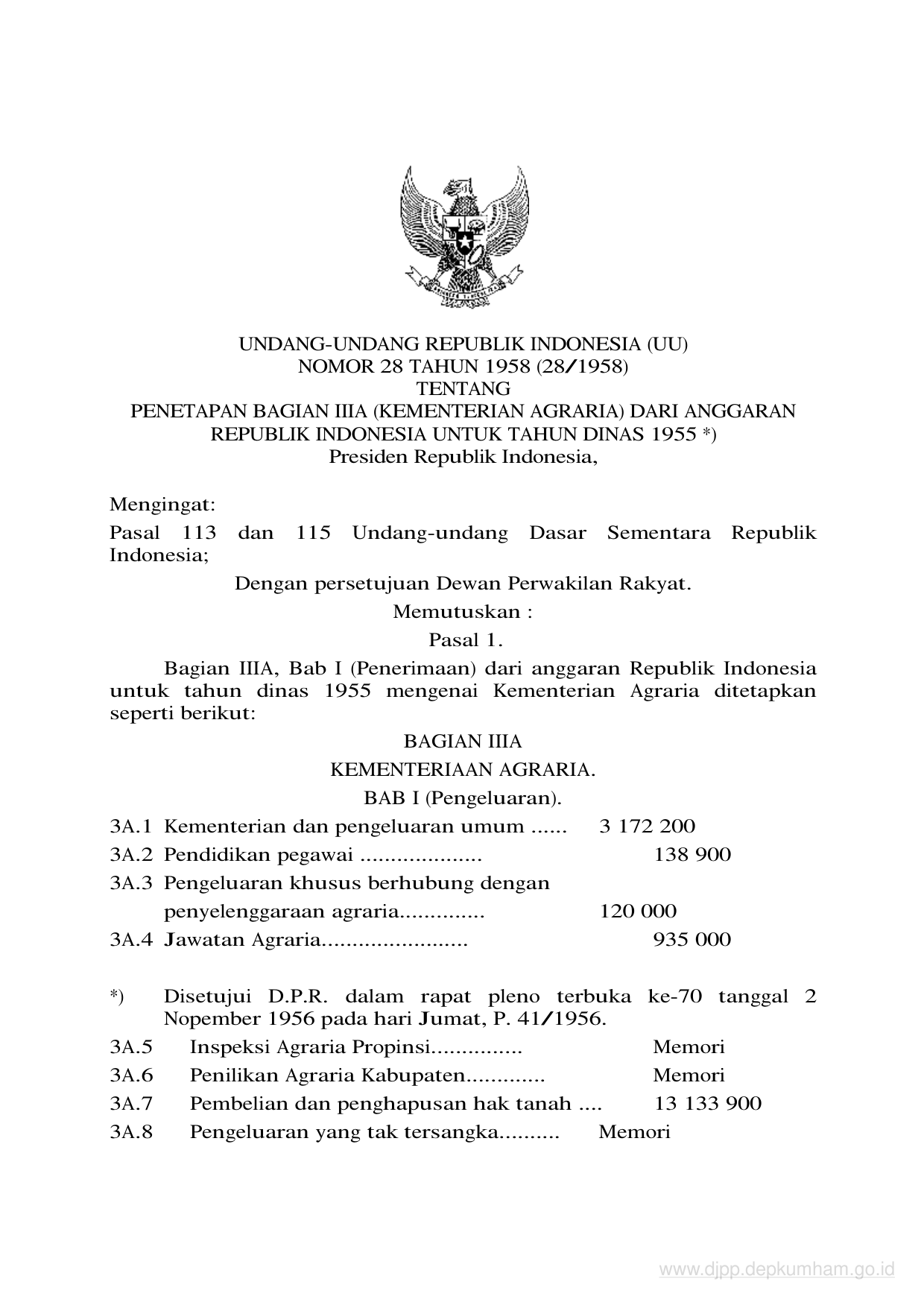 UU Nomor 28 Tahun 1958 | Undang-Undang Nomor 28 Tahun 1958 tentang PENETAPAN BAGIAN IIIA (KEMENTERIAN AGRARIA) DARI ANGGARAN REPUBLIK INDONESIA UNTUK TAHUN DINAS 1955