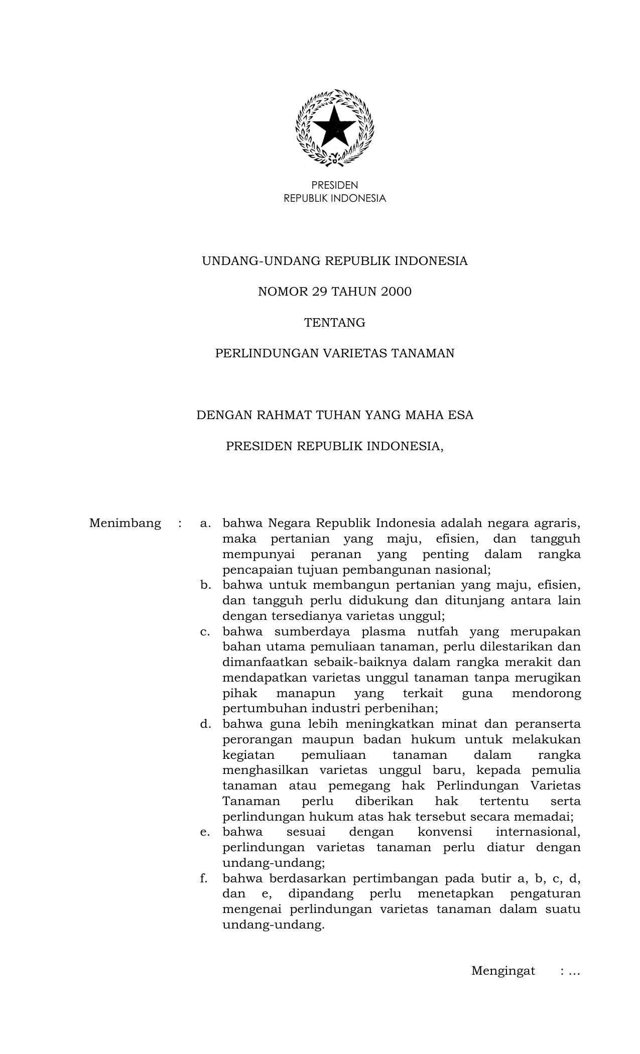UU Nomor 29 Tahun 2000 | Undang-Undang Nomor 29 Tahun 2000 tentang PERLINDUNGAN VARIETAS TANAMAN