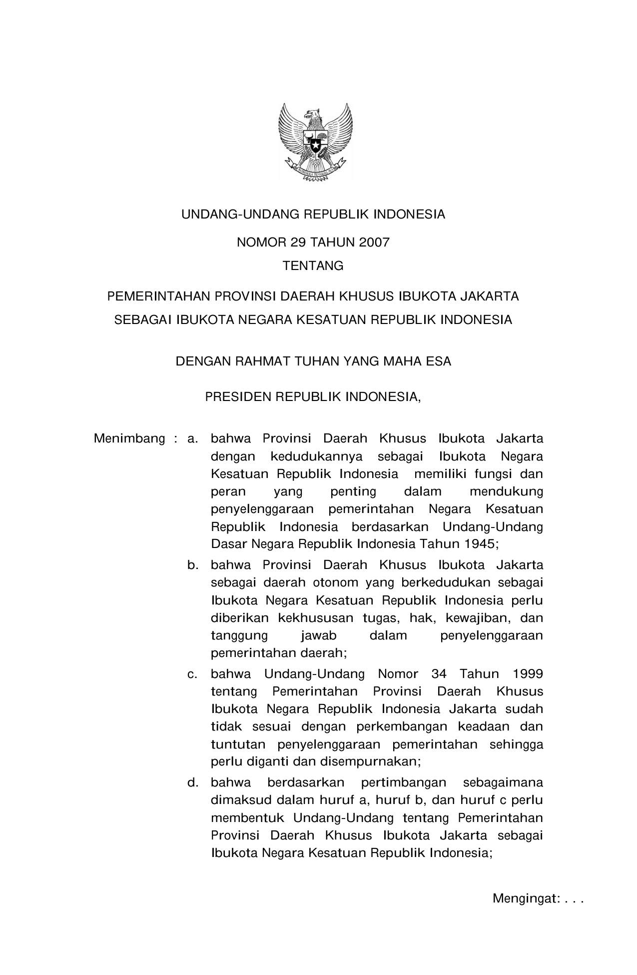 UU Nomor 29 Tahun 2007 | Undang-Undang Nomor 29 Tahun 2007 tentang PEMERINTAHAN PROVINSI DAERAH KHUSUS IBUKOTA JAKARTA SEBAGAI IBUKOTA NEGARA KESATUAN RI