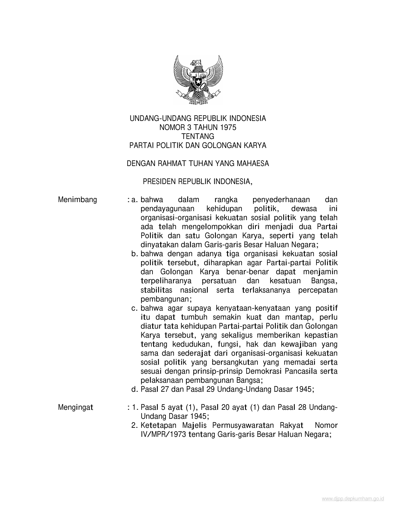 UU Nomor 3 Tahun 1975 | Undang-Undang Nomor 3 Tahun 1975 tentang PARTAI POLITIK DAN GOLONGAN KARYA