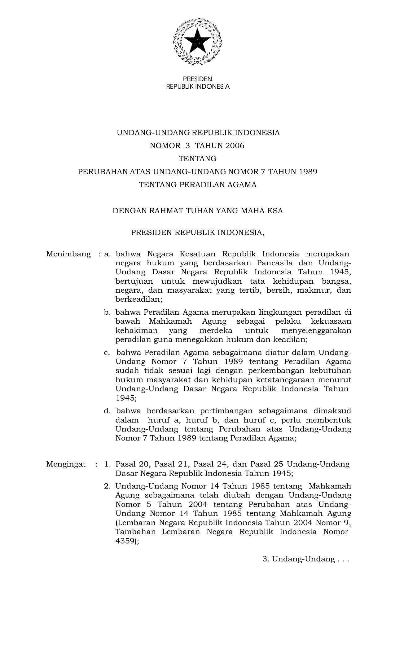 UU Nomor 3 Tahun 2006 | Undang-Undang Nomor 3 Tahun 2006 tentang PERUBAHAN UU 7-1989 TENTANG PERADILAN AGAMA