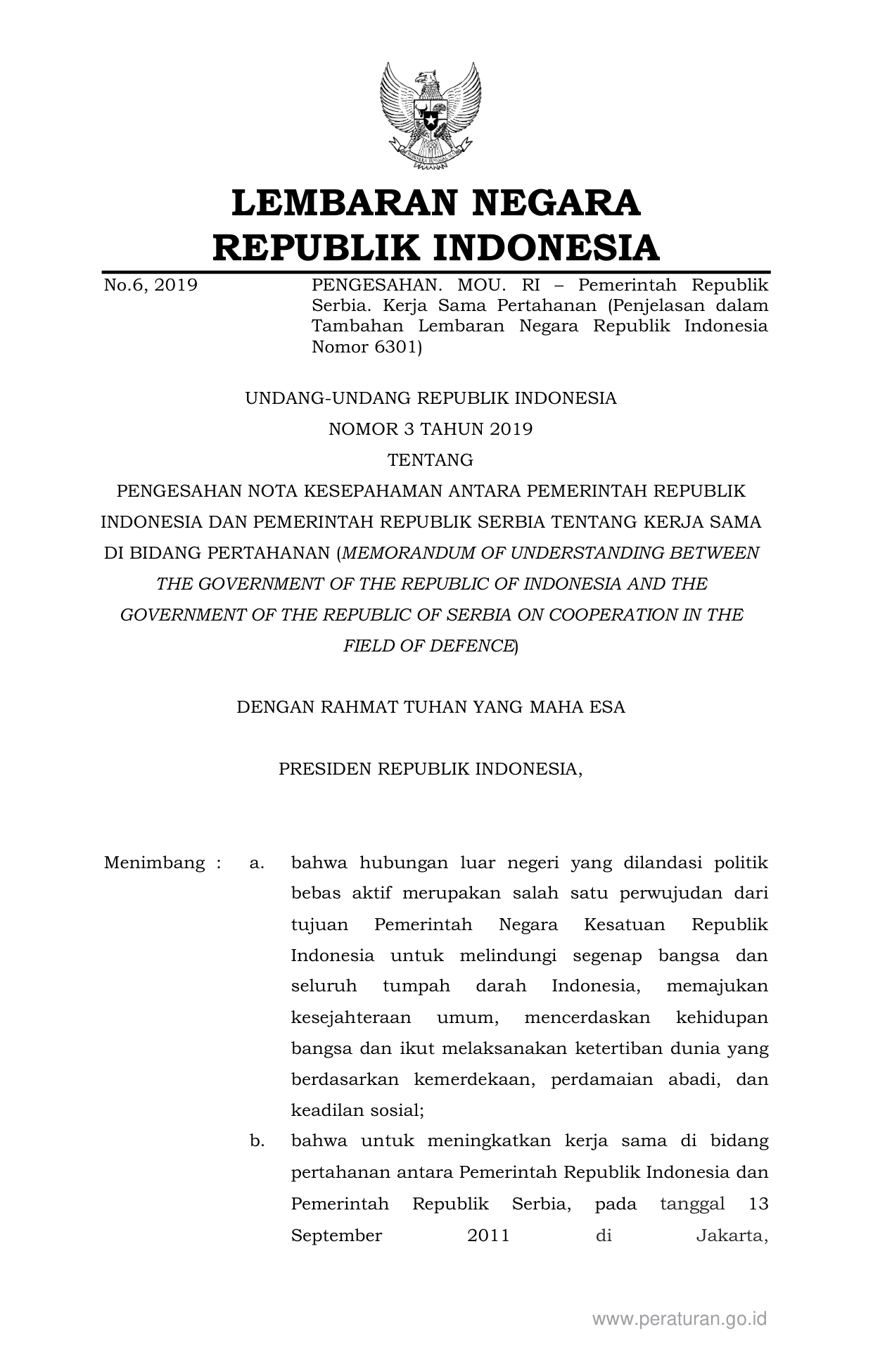 UU Nomor 3 Tahun 2019 | Undang-Undang Nomor 3 Tahun 2019 tentang PENGESAHAN NOTA KESEPAHAMAN ANTARA PEMERINTAH REPUBLIK INDONESIA DAN PEMERINTAH REPUBLIK SERBIA TENTANG KERJA SAMA DI BIDANG PERTAHANAN (MEMORANDUM OF UNDERSTANDING BETWEEN THE GOVERNMENT OF THE REPUBLIC OF INDONESIA AND THE GOVERNMENT OF THE REPUBLIC OF SERBIA ON COOPERATION IN THE FIELD OF DEFENCE)