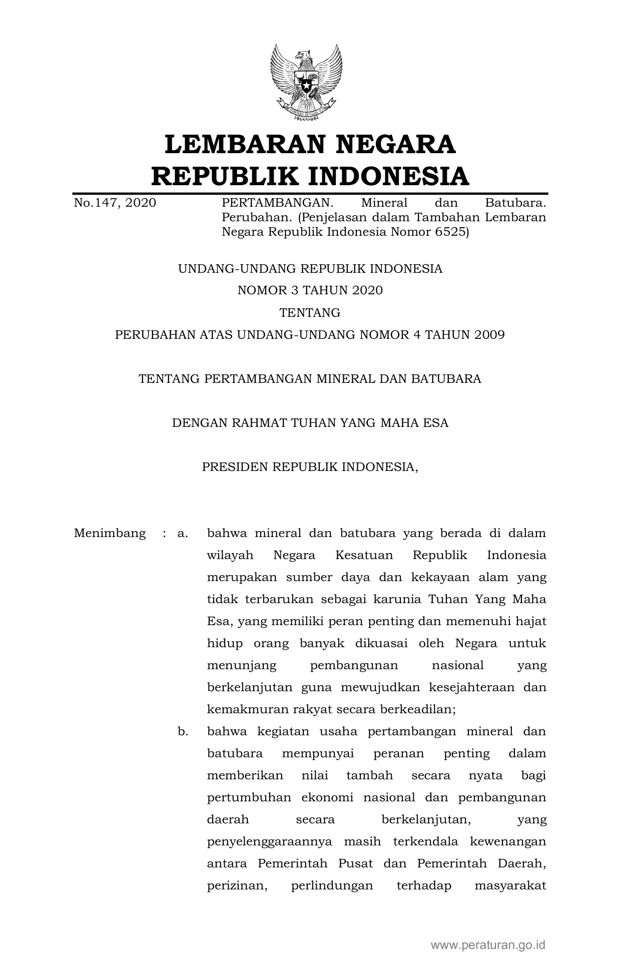 UU Nomor 3 Tahun 2020 | Undang-Undang Nomor 3 Tahun 2020 tentang PERUBAHAN ATAS UNDANG-UNDANG NOMOR 4 TAHUN 2009 TENTANG PERTAMBANGAN MINERAL DAN BATUBARA