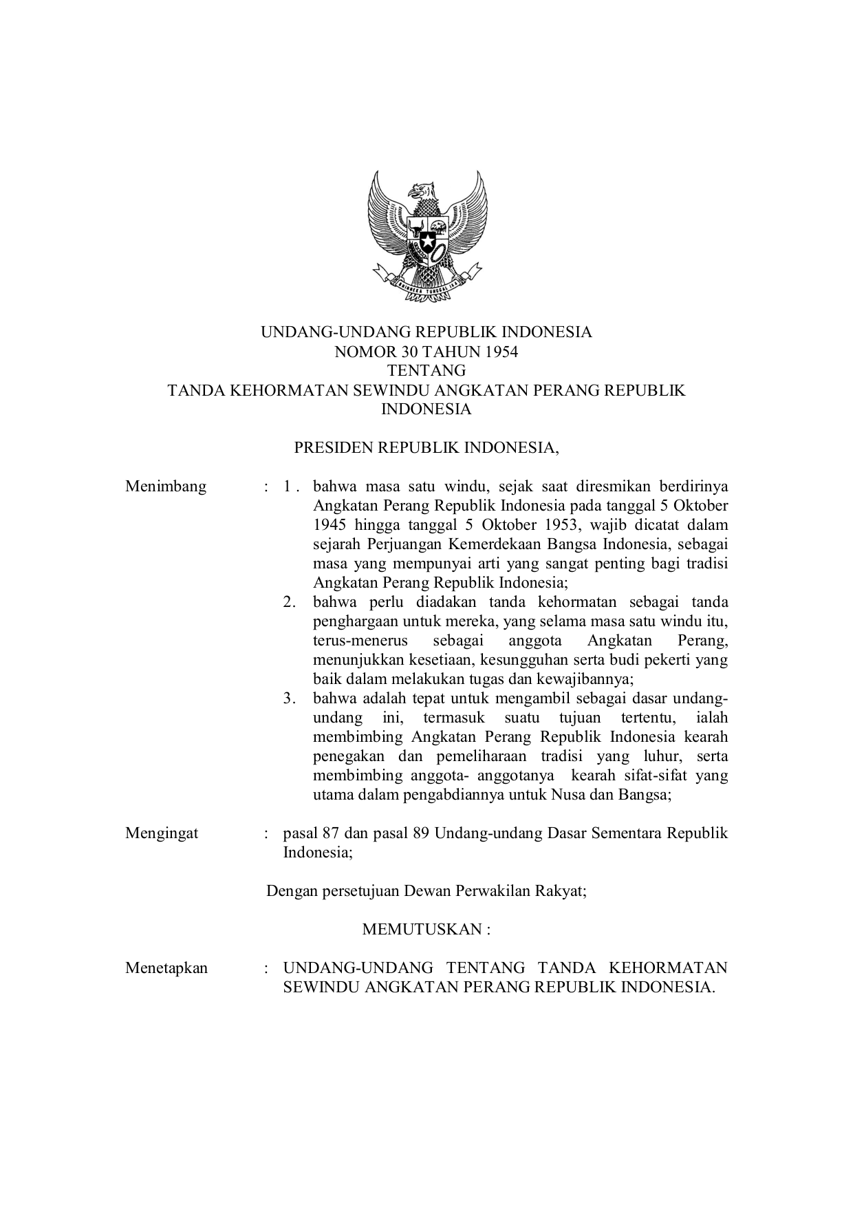 UU Nomor 30 Tahun 1954 | Undang-Undang Nomor 30 Tahun 1954 tentang TANDA KEHORMATAN SEWINDU ANGKATAN PERANG REPUBLIK INDONESIA