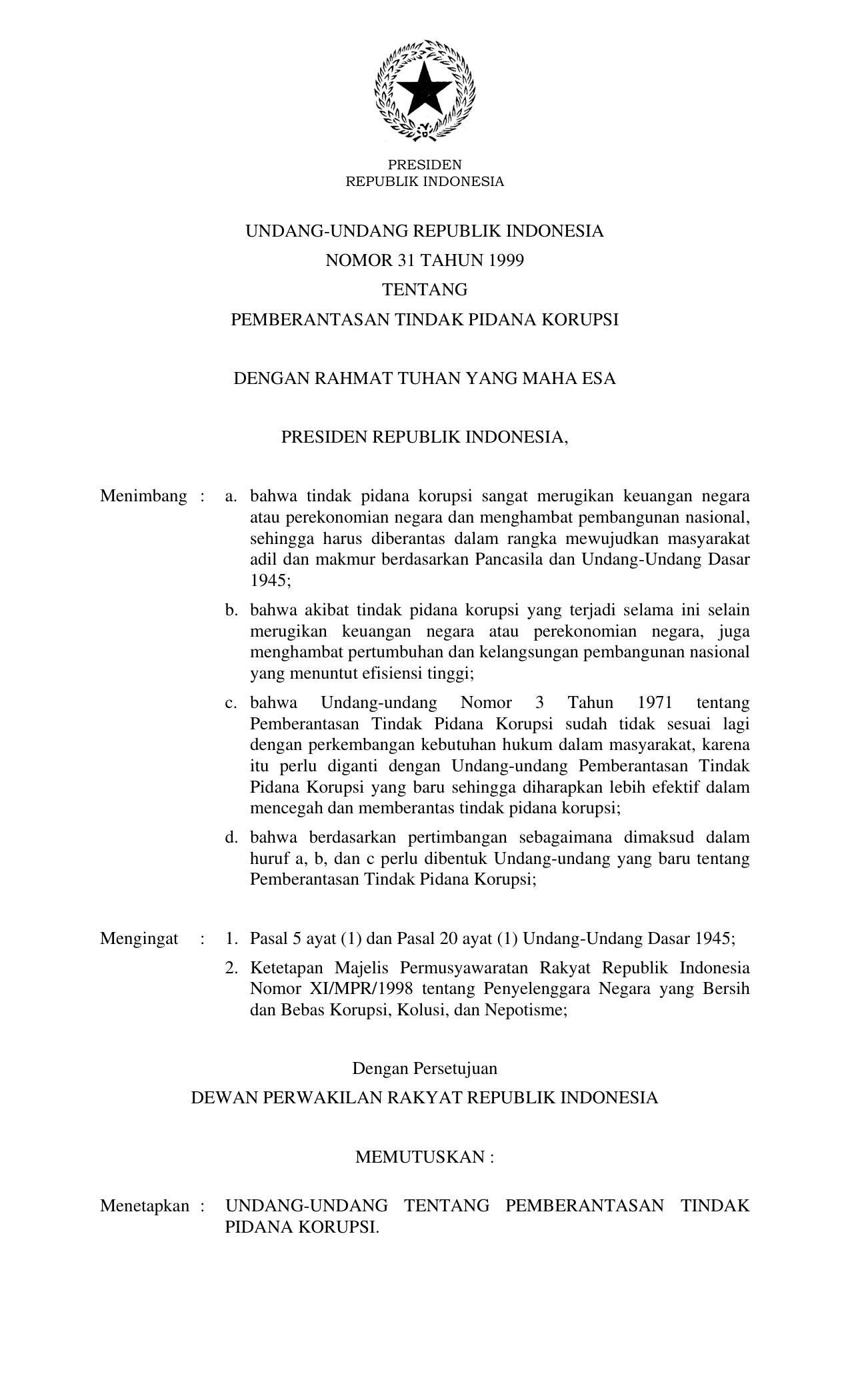 UU Nomor 31 Tahun 1999 | Undang-Undang Nomor 31 Tahun 1999 tentang PEMBERANTASAN TINDAK PIDANA KORUPSI