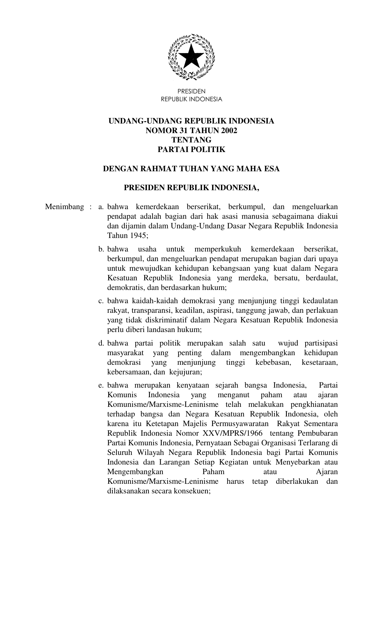 UU Nomor 31 Tahun 2002 | Undang-Undang Nomor 31 Tahun 2002 tentang PARTAI POLITIK