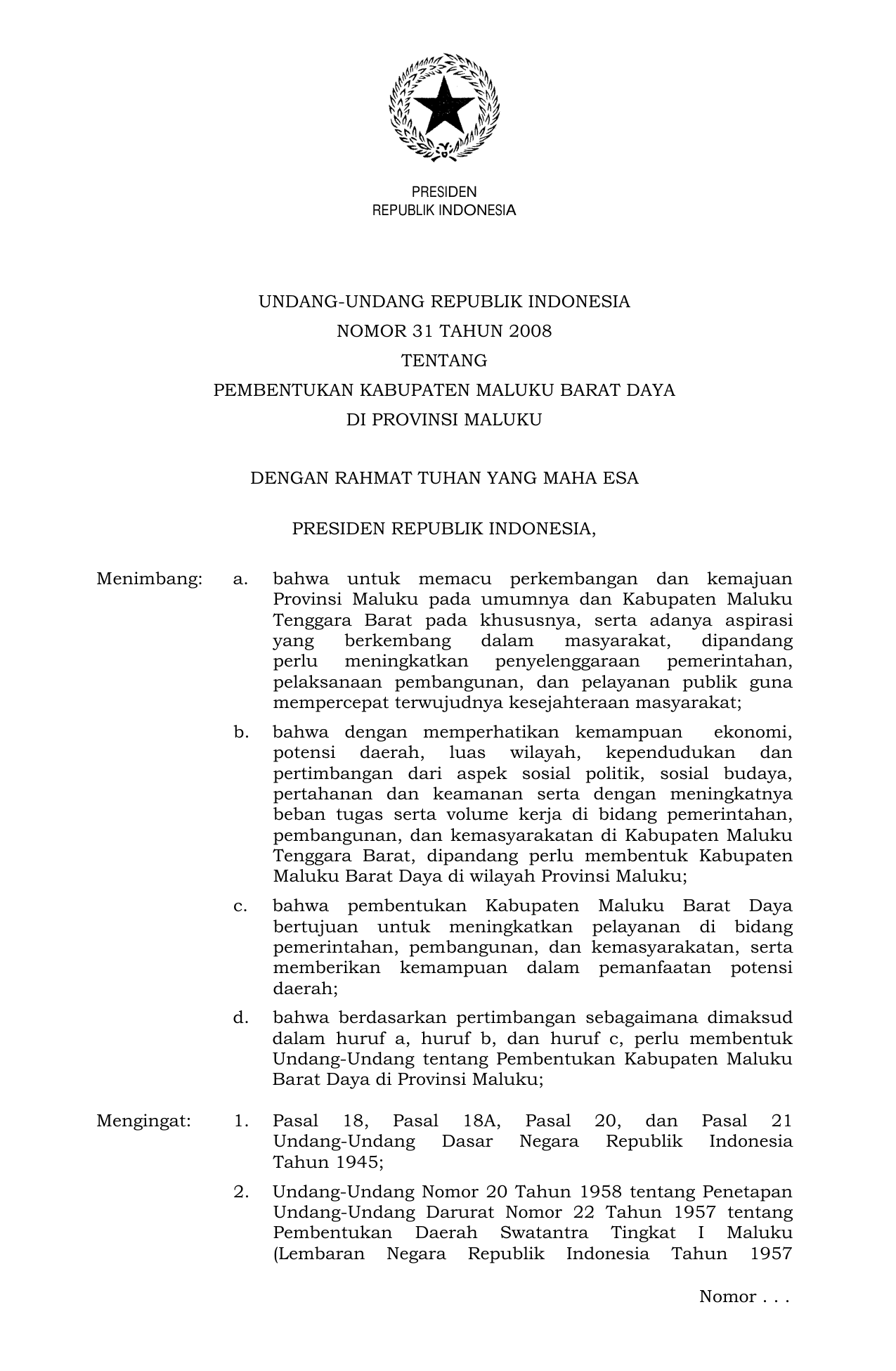 UU Nomor 31 Tahun 2008 | Undang-Undang Nomor 31 Tahun 2008 tentang PEMBENTUKAN KABUPATEN MALUKU BARAT DAYA DI PROVINSI MALUKU