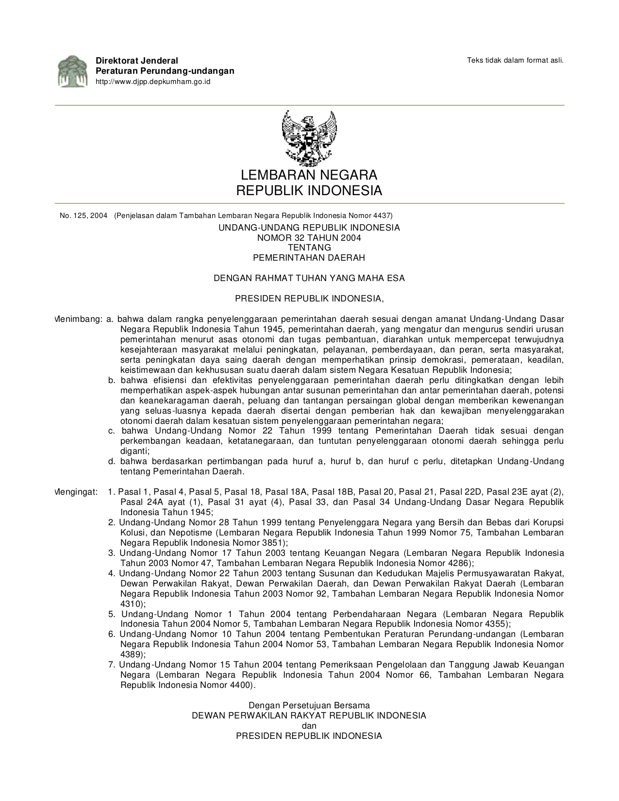 UU Nomor 32 Tahun 2004 | Undang-Undang Nomor 32 Tahun 2004 tentang PEMERINTAHAN DAERAH