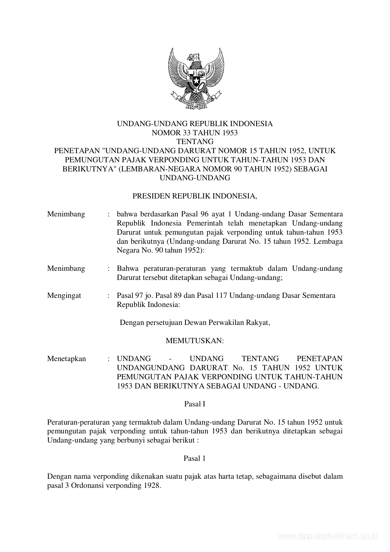 UU Nomor 33 Tahun 1953 | Undang-Undang Nomor 33 Tahun 1953 tentang PENETAPAN �UNDANG-UNDANG DARURAT NOMOR 19 TAHUN 1951, TENTANG PEMUNGUTAN PAJAK PENJUALAN� (LEMBARAN-NEGARA NOMOR 94 TAHUN 1951) SEBAGAI UNDANG-UNDANG