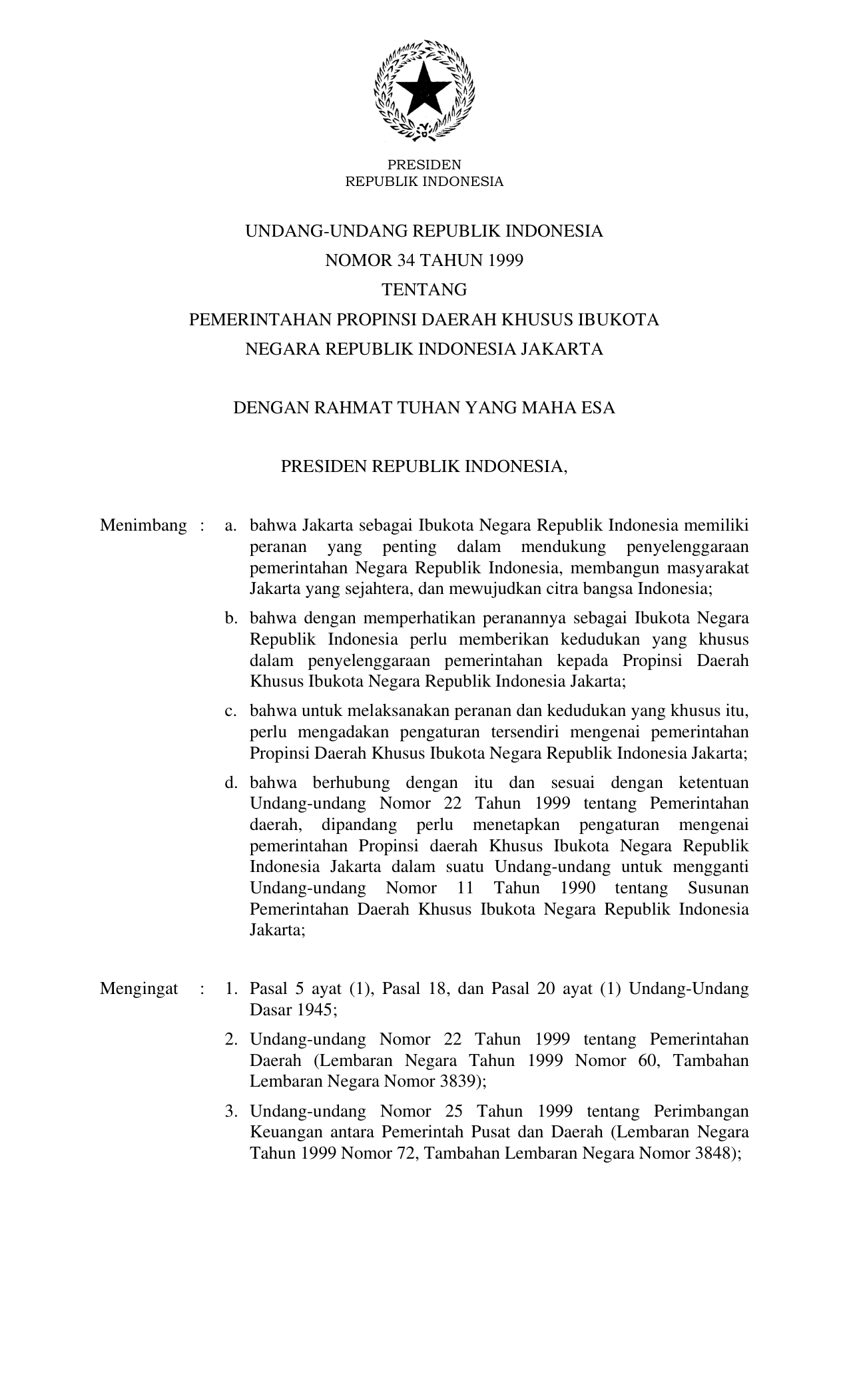UU Nomor 34 Tahun 1999 | Undang-Undang Nomor 34 Tahun 1999 tentang PEMERINTAHAN PROVINSI DAERAH KHUSUS IBUKOTA NEGARA RI JAKARTA