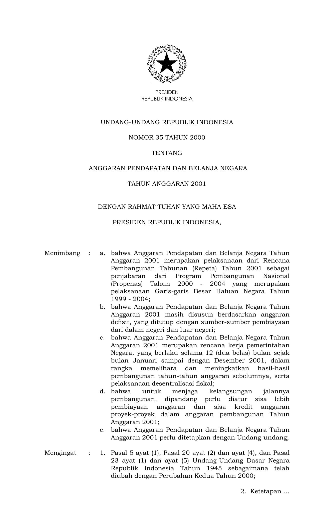 UU Nomor 35 Tahun 2000 | Undang-Undang Nomor 35 Tahun 2000 tentang ANGGARAN PENDAPATAN DAN BELANJA NEGARA TAHUN ANGGARAN 2001