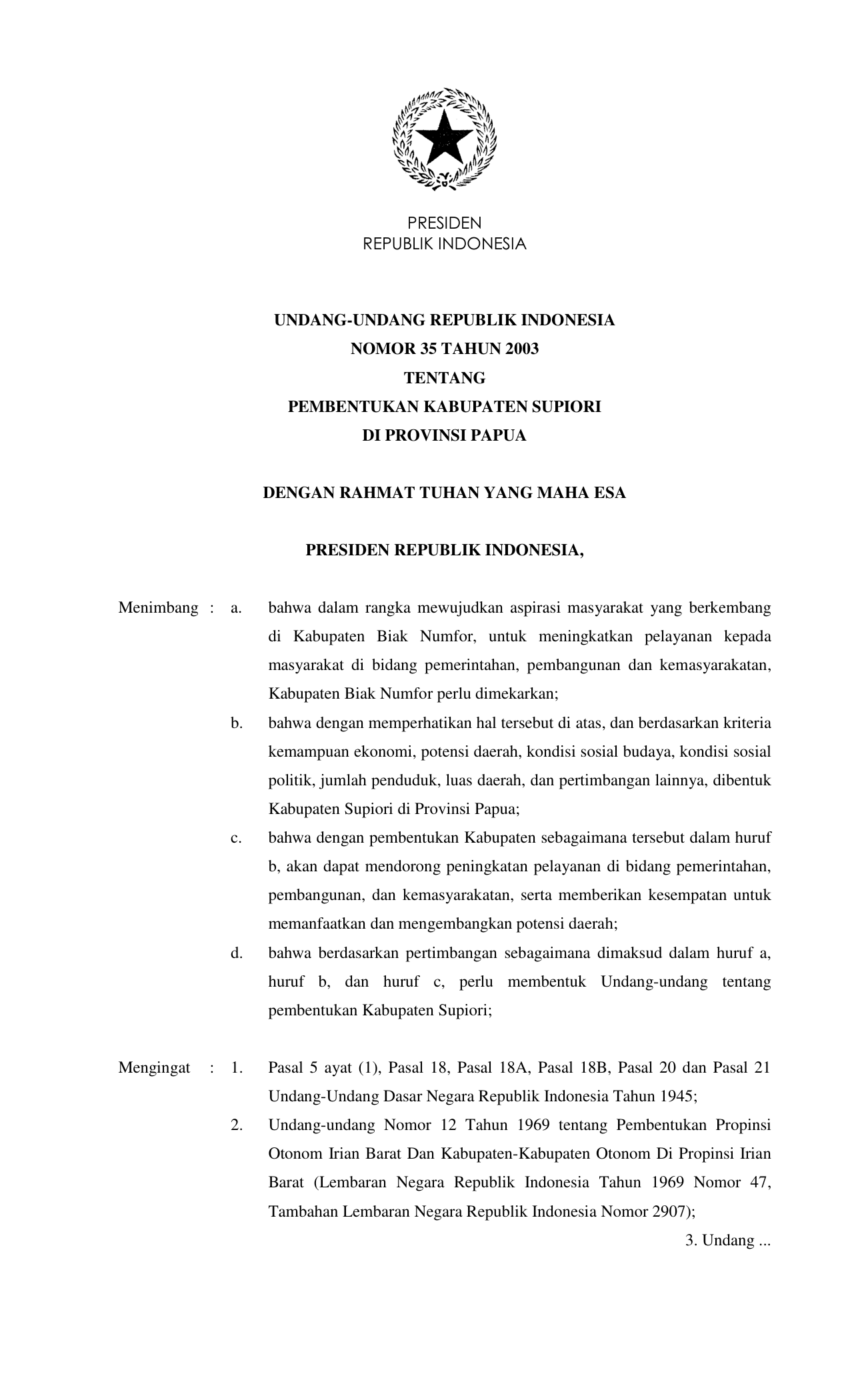 UU Nomor 35 Tahun 2003 | Undang-Undang Nomor 35 Tahun 2003 tentang PEMBENTUKAN KABUPATEN SUPIORI DI PROVINSI PAPUA