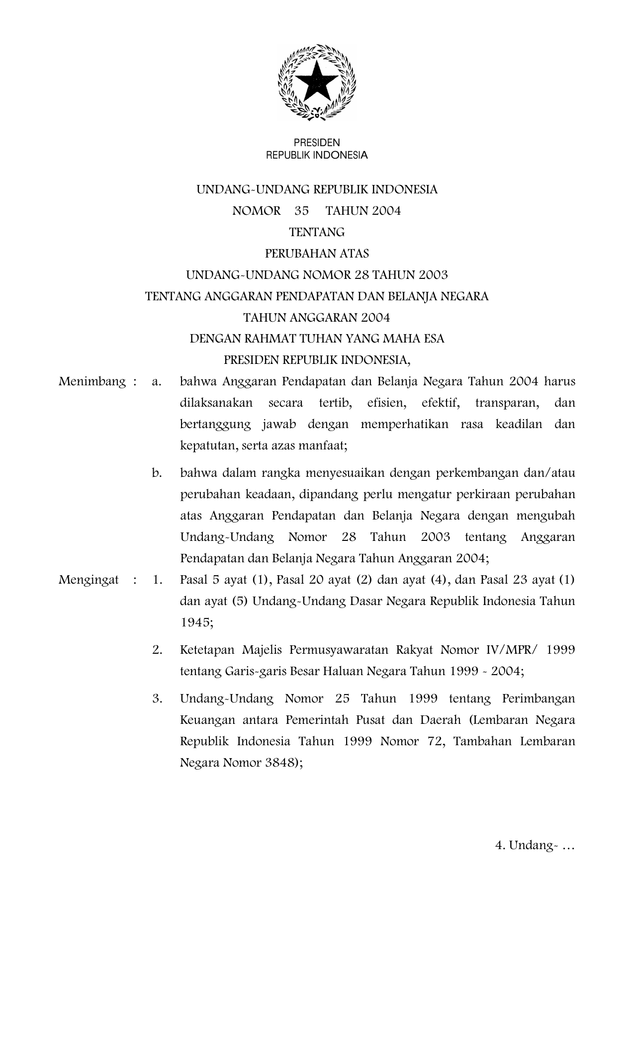 UU Nomor 35 Tahun 2004 | Undang-Undang Nomor 35 Tahun 2004 tentang PERUBAHAN UU 28-2003 TENTANG ANGGARAN PENDAPATAN DAN BELANJA NEGARA TAHUN ANGGARAN 2004