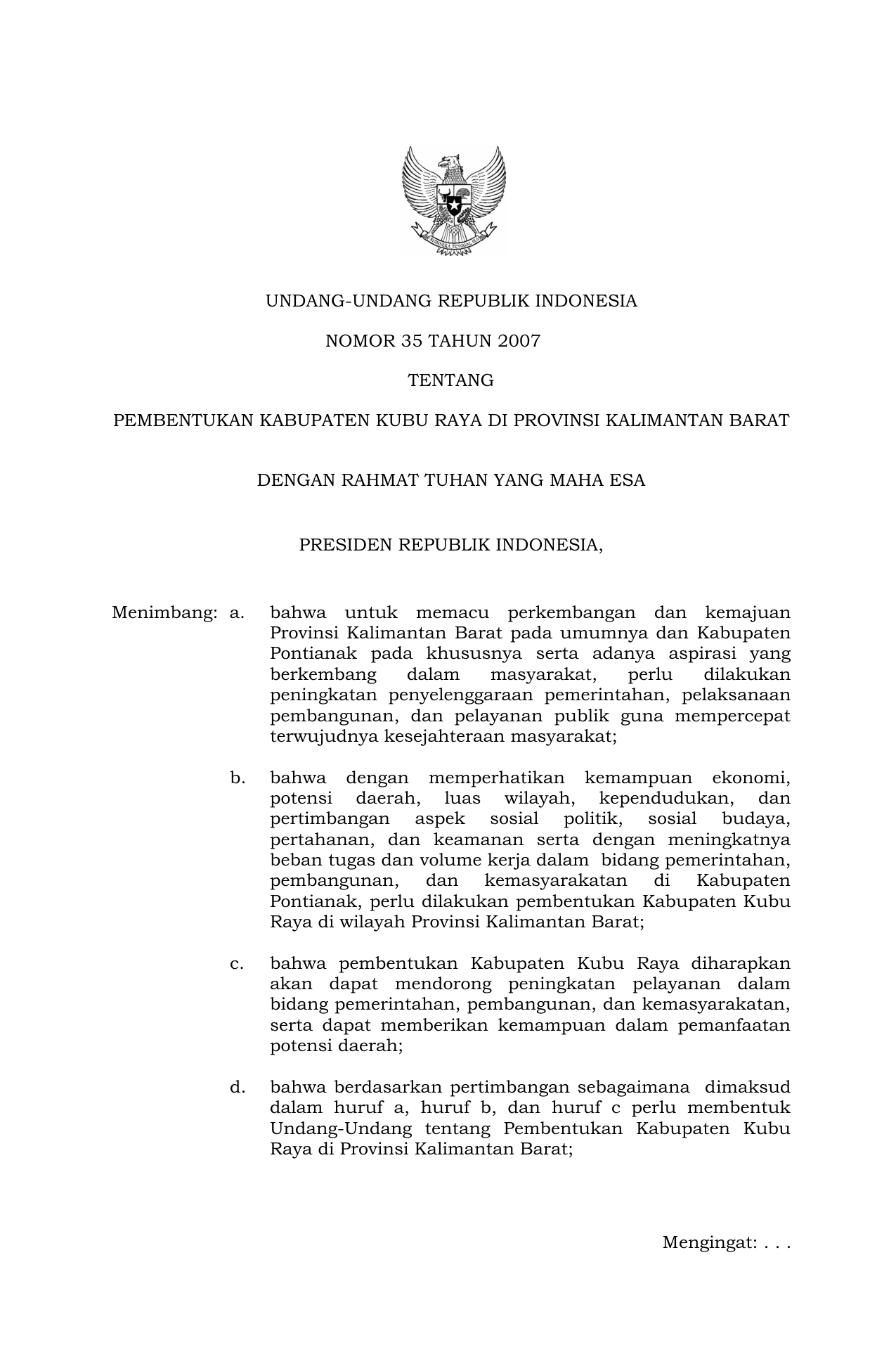 UU Nomor 35 Tahun 2007 | Undang-Undang Nomor 35 Tahun 2007 tentang PEMBENTUKAN KABUPATEN KUBU RAYA DI PROVINSI KALIMANTAN BARAT