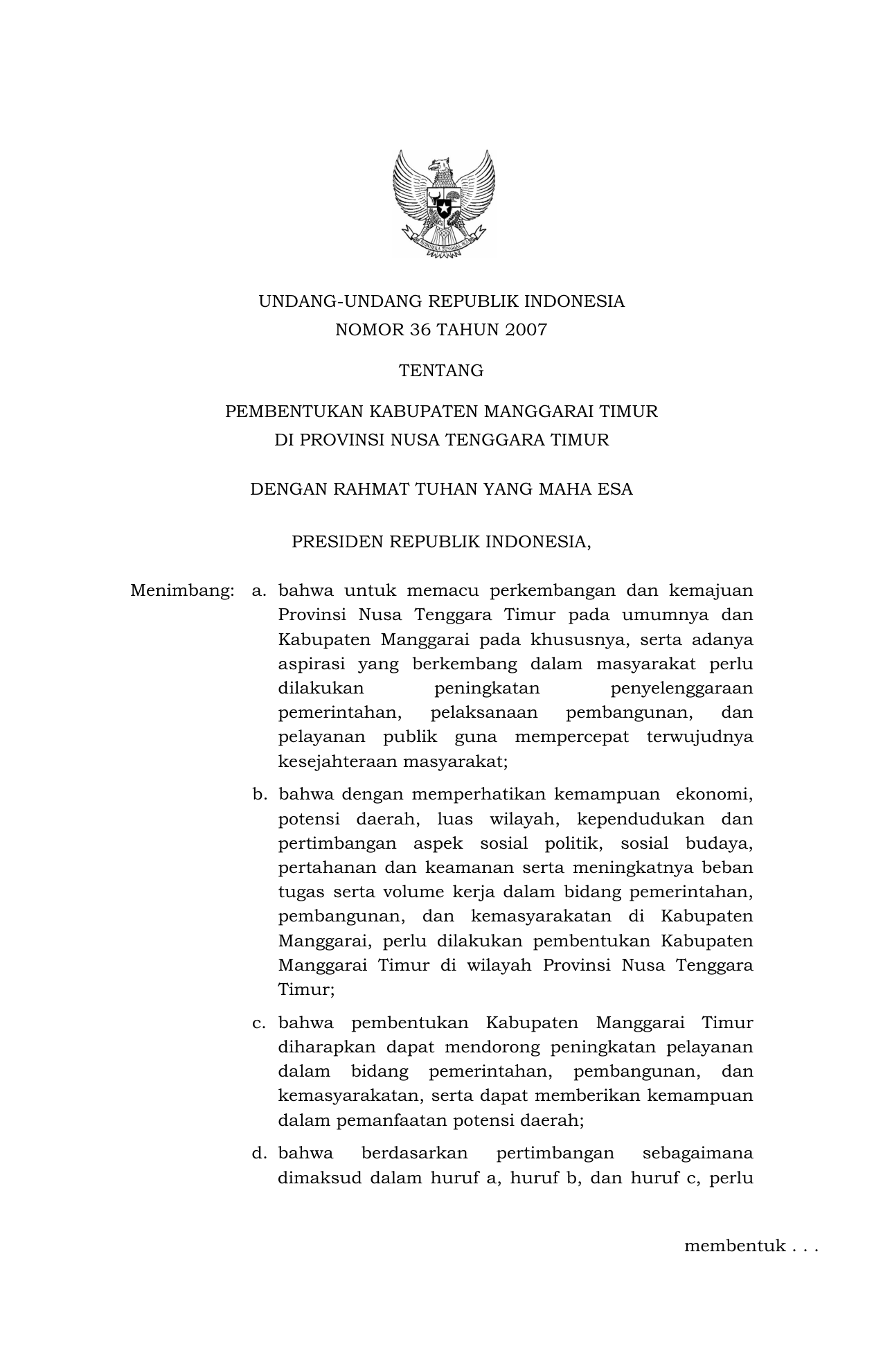 UU Nomor 36 Tahun 2007 | Undang-Undang Nomor 36 Tahun 2007 tentang PEMBENTUKAN KABUPATEN MANGGARAI TIMUR DI PROVINSI NUSA TENGGARA TIMUR