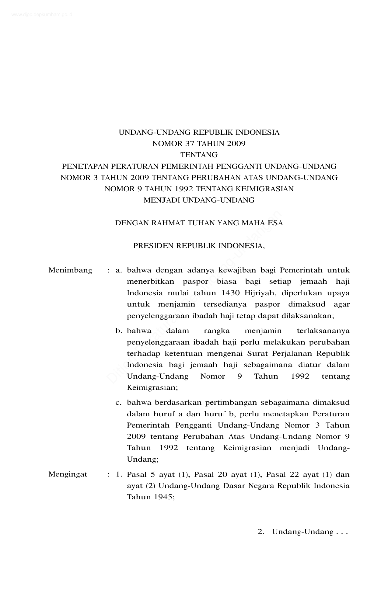 UU Nomor 37 Tahun 2009 | Undang-Undang Nomor 37 Tahun 2009 tentang PENETAPAN PERATURAN PEMERINTAH PENGGANTI UNDANG-UNDANG NOMOR 3 TAHUN 2009 TENTANG PERUBAHAN ATAS UNDANG-UNDANG NOMOR 9 TAHUN 1992 TENTANG KEIMIGRASIAN MENJADI UNDANG-UNDANG