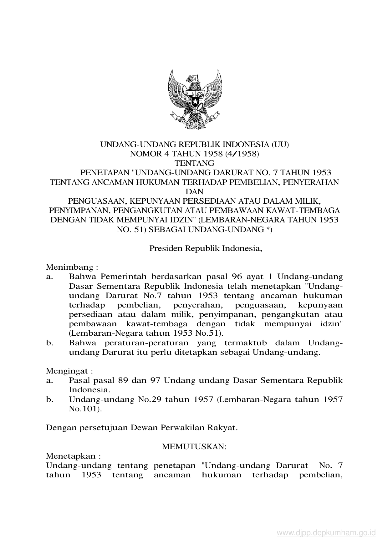 UU Nomor 4 Tahun 1958 | Undang-Undang Nomor 4 Tahun 1958 tentang PENETAPAN QUOTUNDANGUNDANG DARURAT NO7 TAHUN 1953 TENTANG ANCAMAN HUKUMAN TERHADAP PEMBELIAN PENYERAHAN DAN PENGUASAAN KEPUNYAAN PERSEDIAAN ATAU DALAM MILIK PENYIMPANAN PENGANGKUTAN ATAU PEMBAWAAN KAWATTEMBAGA DENGAN TIDAK MEMPUNYAI IDZINQUOT LEMBARANNEGARA TAHUN 1953 NO51 SEBAGAI UNDANGUNDANG