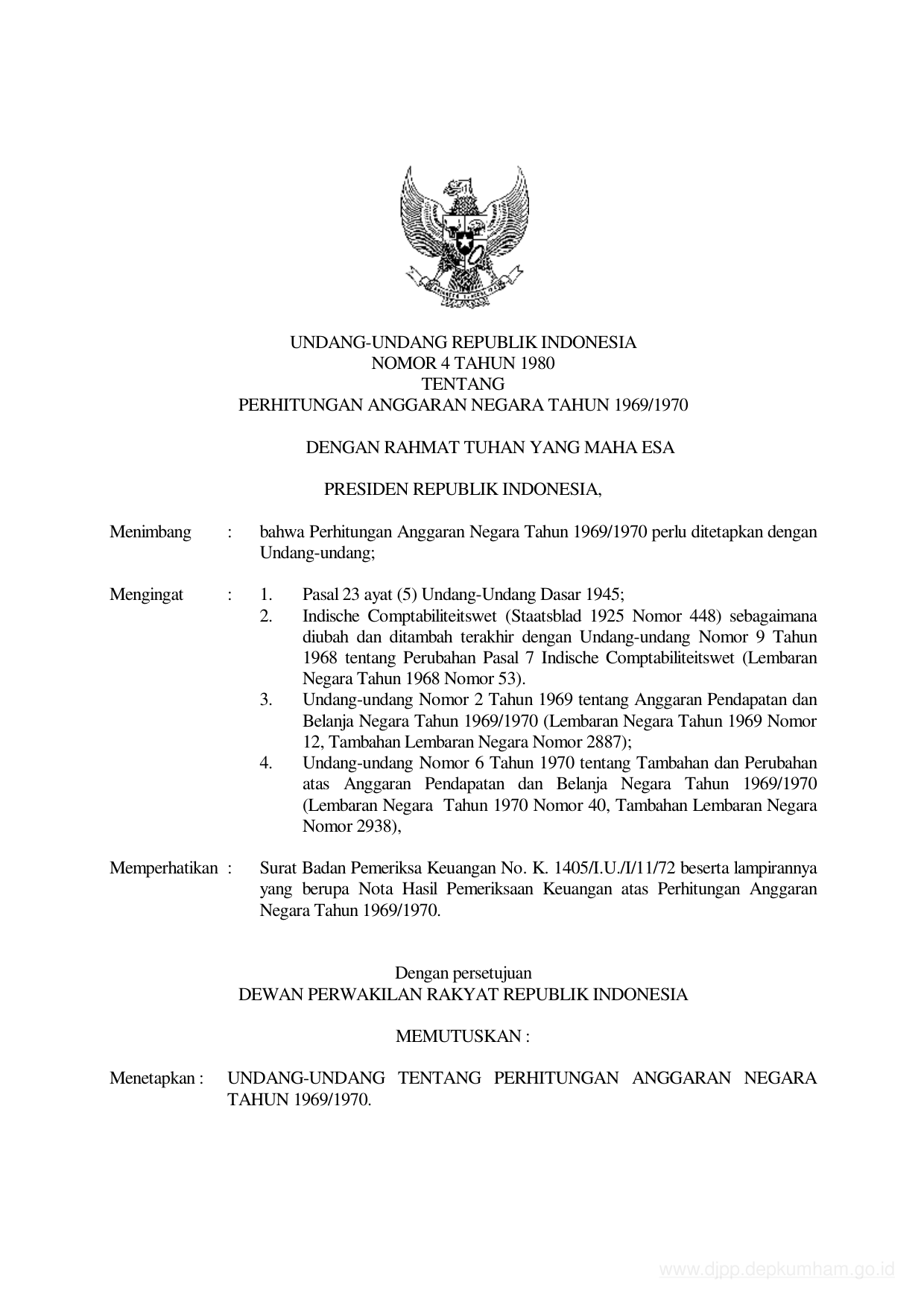 UU Nomor 4 Tahun 1980 | Undang-Undang Nomor 4 Tahun 1980 tentang PERHITUNGAN ANGGARAN NEGARA TAHUN 1969/1970