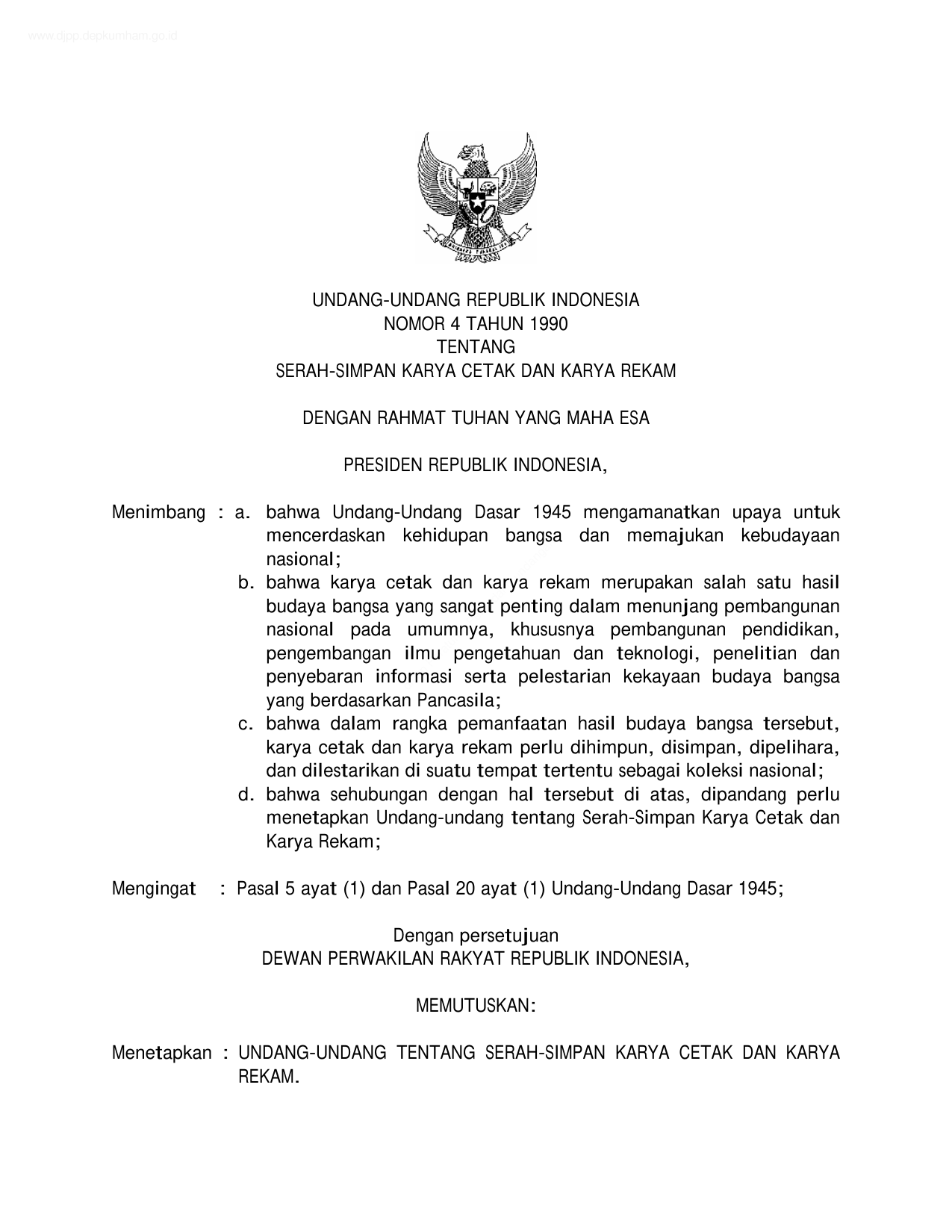 UU Nomor 4 Tahun 1990 | Undang-Undang Nomor 4 Tahun 1990 tentang SERAH-SIMPAN KARYA CETAK DAN KARYA REKAM