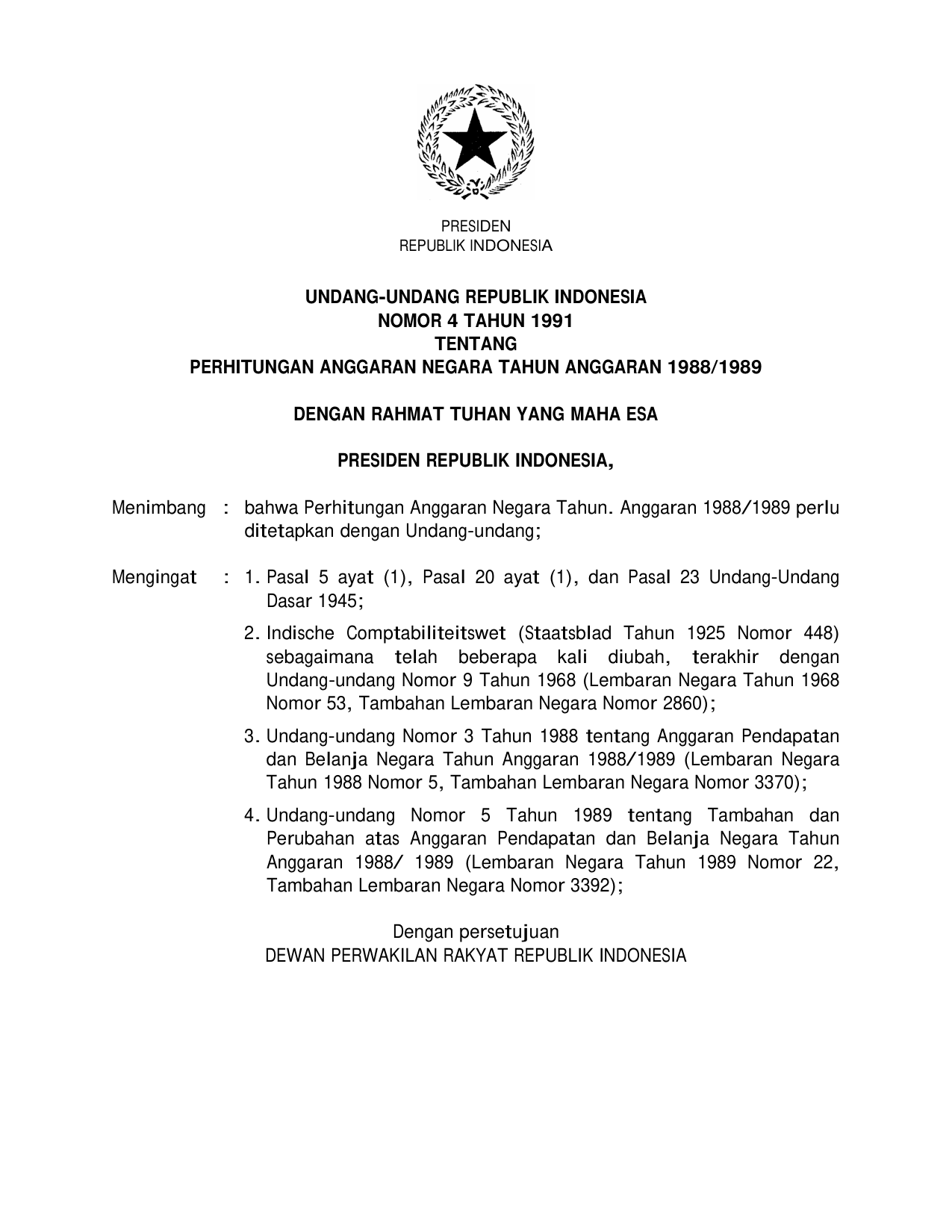 UU Nomor 4 Tahun 1991 | Undang-Undang Nomor 4 Tahun 1991 tentang PERHITUNGAN ANGGARAN NEGARA TAHUN ANGGARAN 1988/1989