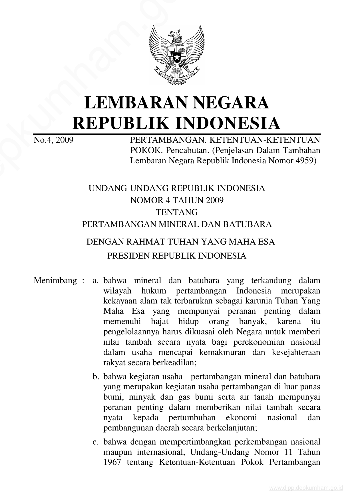 UU Nomor 4 Tahun 2009 | Undang-Undang Nomor 4 Tahun 2009 tentang PERTAMBANGAN MINERAL DAN BATUBARA