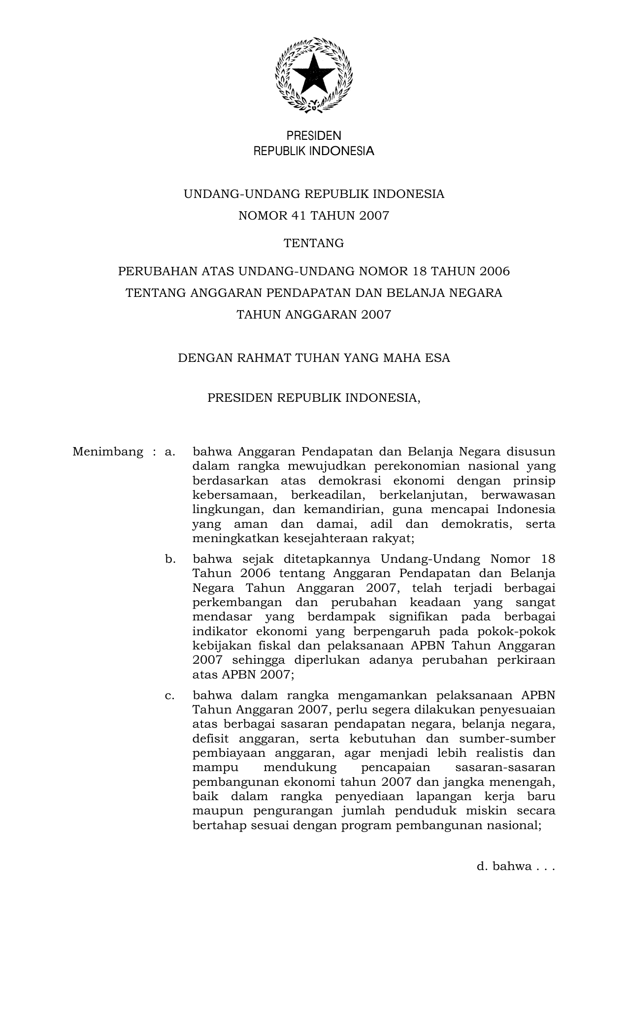 UU Nomor 41 Tahun 2007 | Undang-Undang Nomor 41 Tahun 2007 tentang PERUBAHAN UU 18-2006 TENTANG ANGGARAN PENDAPATAN DAN BELANJA NEGARA TAHUN ANGGARAN 2007