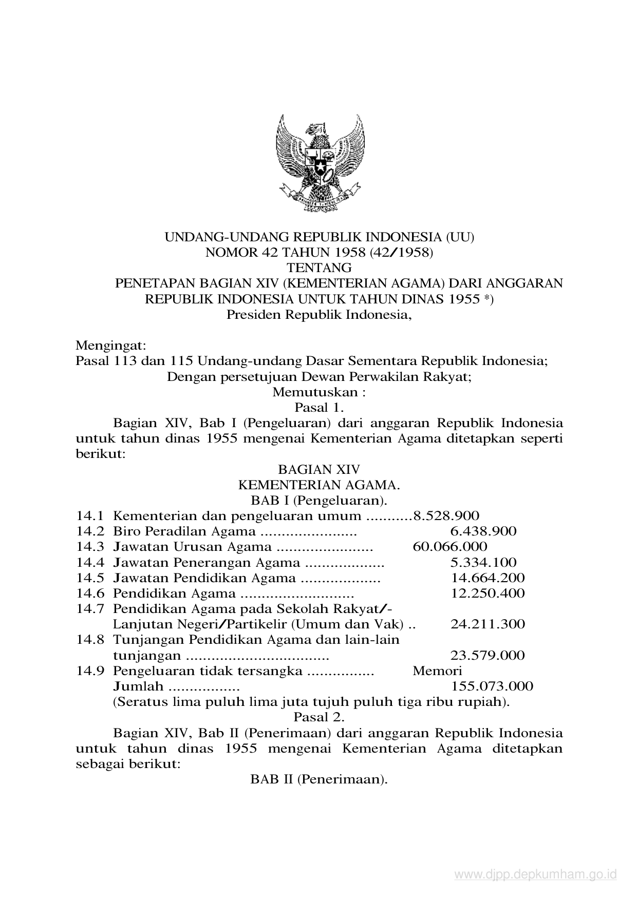 UU Nomor 42 Tahun 1958 | Undang-Undang Nomor 42 Tahun 1958 tentang PENETAPAN BAGIAN XIV (KEMENTERIAN AGAMA) DARI ANGGARAN REPUBLIK INDONESIA UNTUK TAHUN DINAS 1955