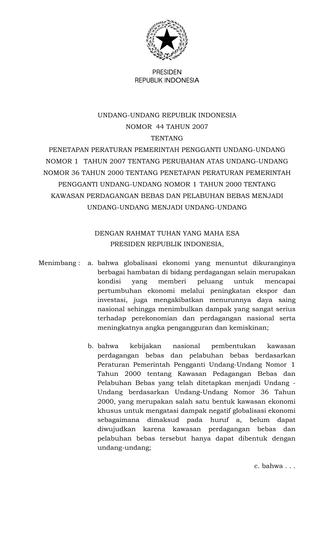 UU Nomor 44 Tahun 2007 | Undang-Undang Nomor 44 Tahun 2007 tentang PENETAPAN PERPU 1-2007 TENTANG PERUBAHAN UU 36-2000 TENTANG PENETAPAN PERPU 1-2000 TENTANG KAWASAN PERDAGANGAN BEBAS DAN PELABUHAN BEBAS MENJADI UU MENJADI UU