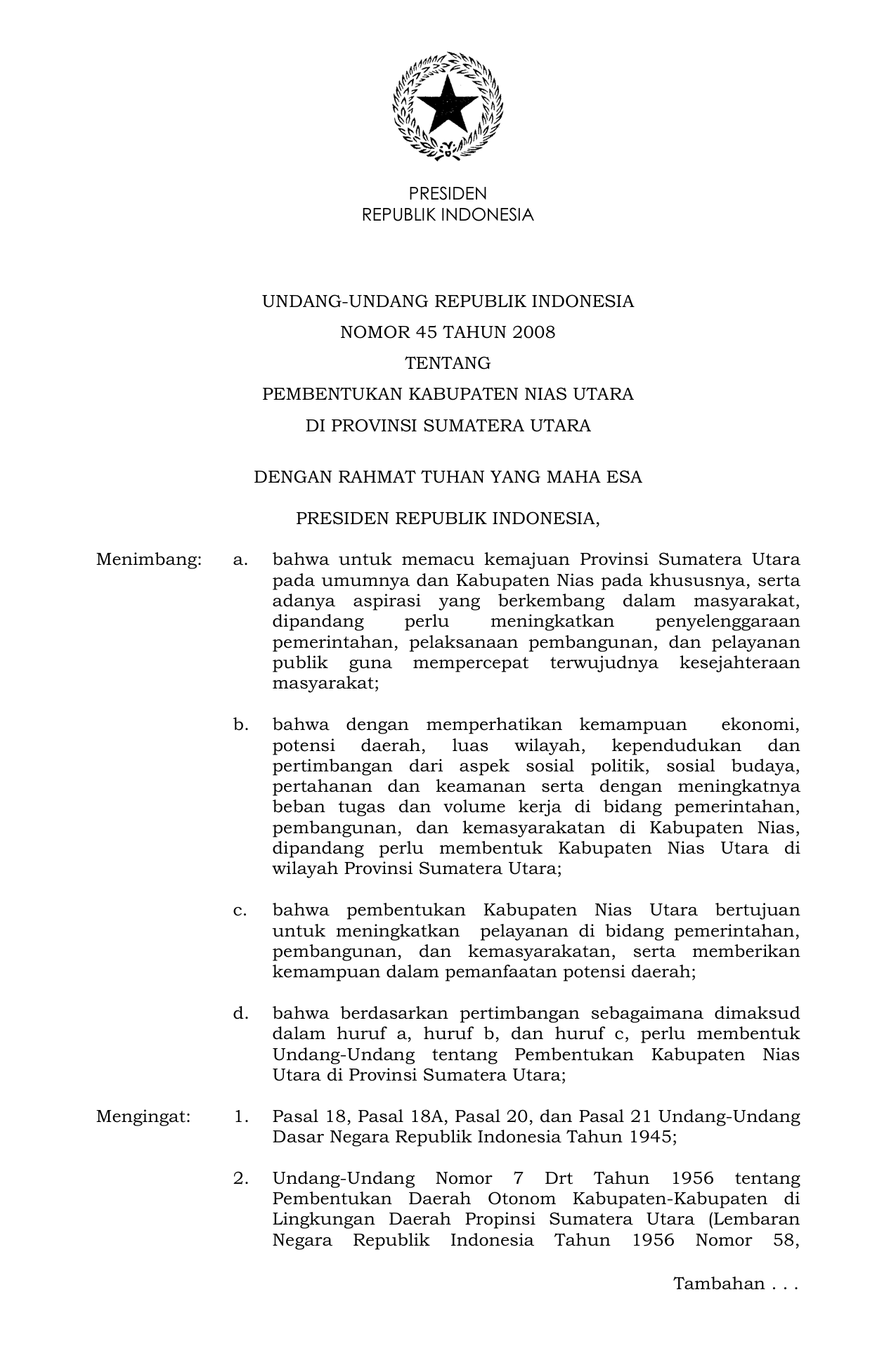 UU Nomor 45 Tahun 2008 | Undang-Undang Nomor 45 Tahun 2008 tentang PEMBENTUKAN KABUPATEN NIAS UTARA DI PROVINSI SUMATERA UTARA
