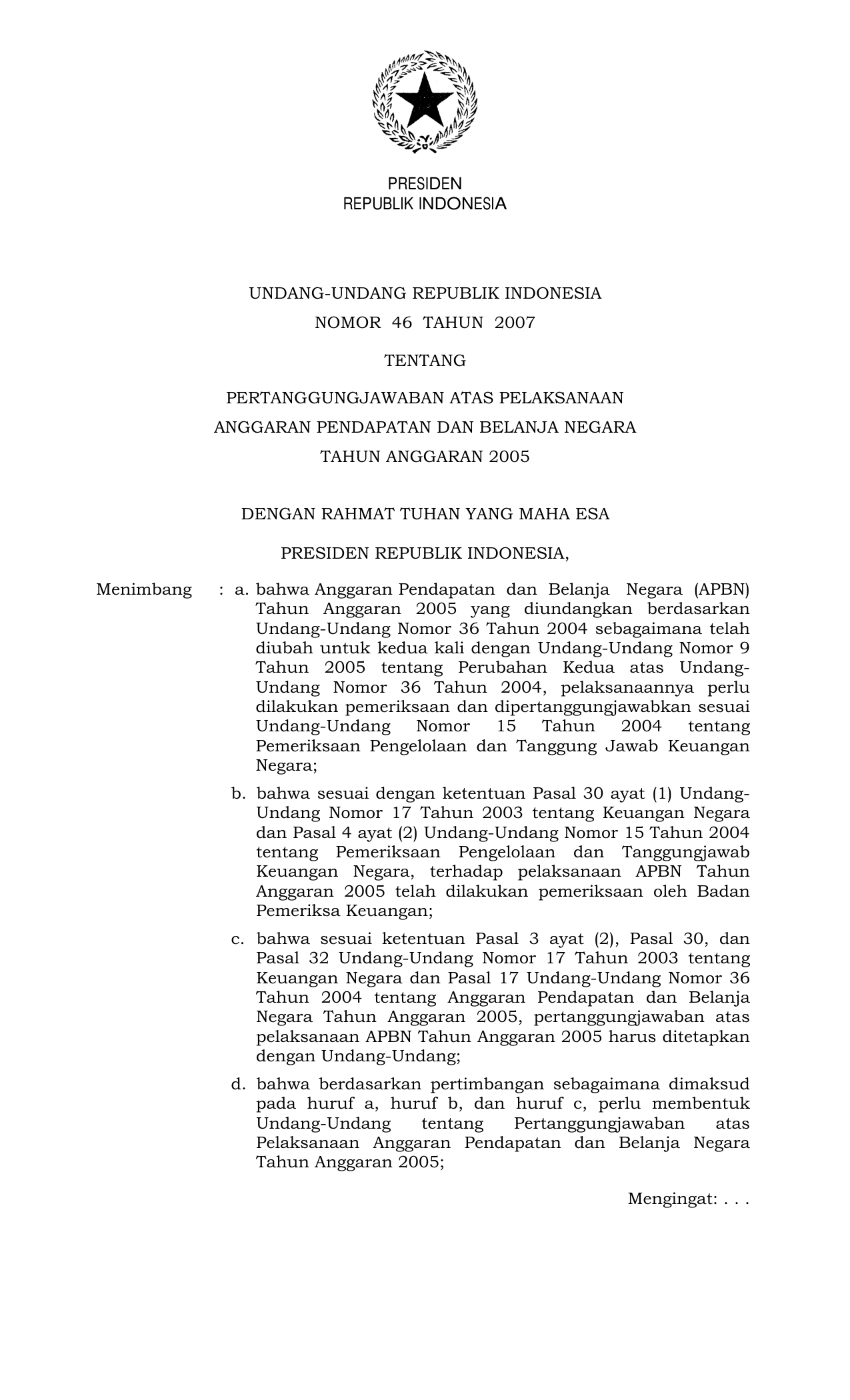 UU Nomor 46 Tahun 2007 | Undang-Undang Nomor 46 Tahun 2007 tentang PERTANGGUNGJAWABAN ATAS PELAKSANAAN ANGGARAN PENDAPATAN DAN BELANJA NEGARA TAHUN ANGGARAN 2005