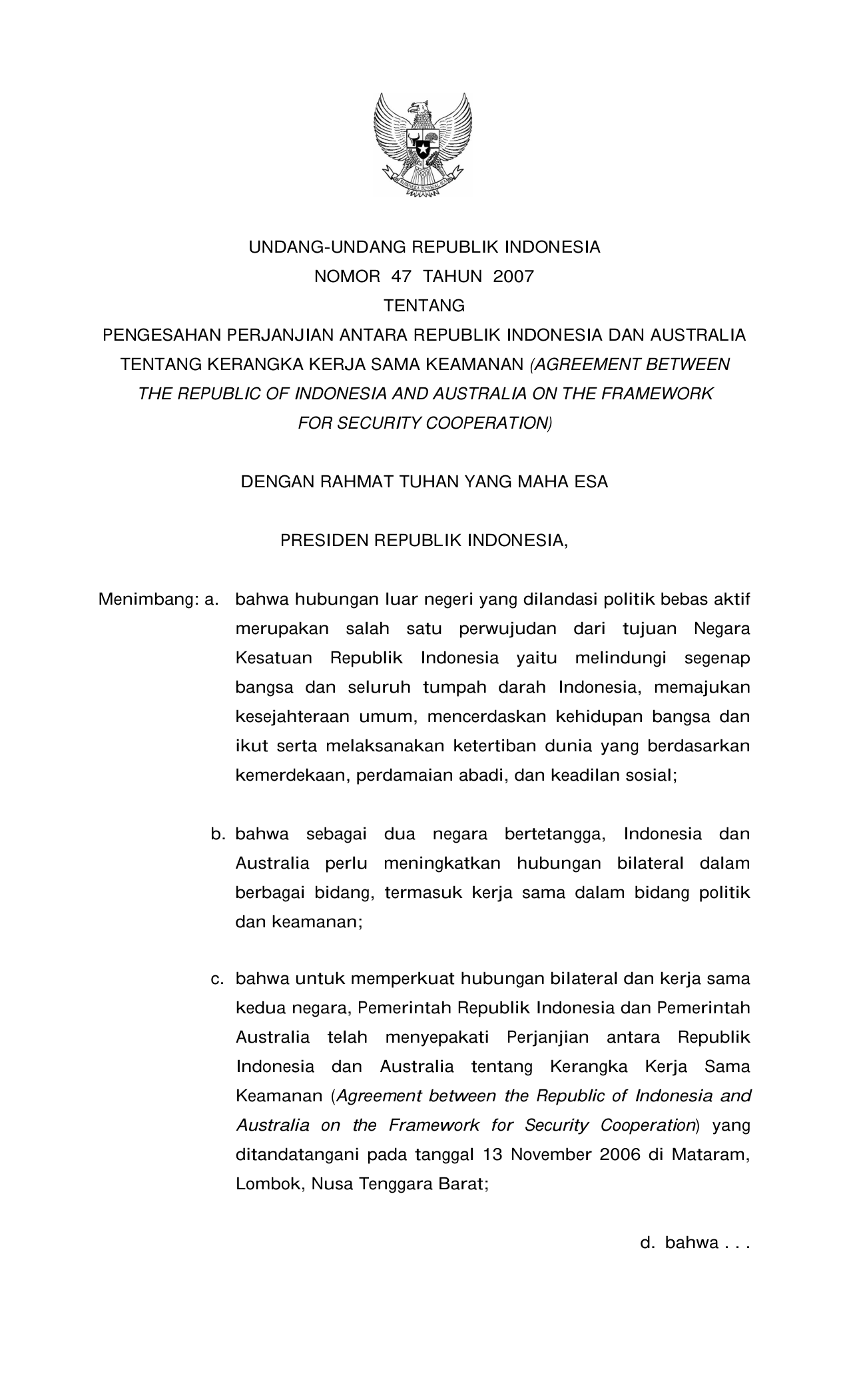 UU Nomor 47 Tahun 2007 | Undang-Undang Nomor 47 Tahun 2007 tentang PENGESAHAN PERJANJIAN ANTARA RI DAN AUSTRALIA TENTANG KERANGKA KERJA SAMA KEAMANAN (AGREEMENT BETWEEN THE REPUBLIC OF INDONESIA AND AUSTRALIA ON THE FRAMEWORK FOR SECURITY COOPERATION)