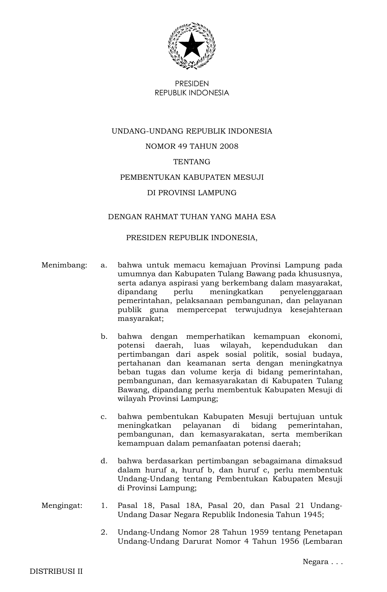 UU Nomor 49 Tahun 2008 | Undang-Undang Nomor 49 Tahun 2008 tentang PEMBENTUKAN KABUPATEN MESUJI DI PROVINSI LAMPUNG