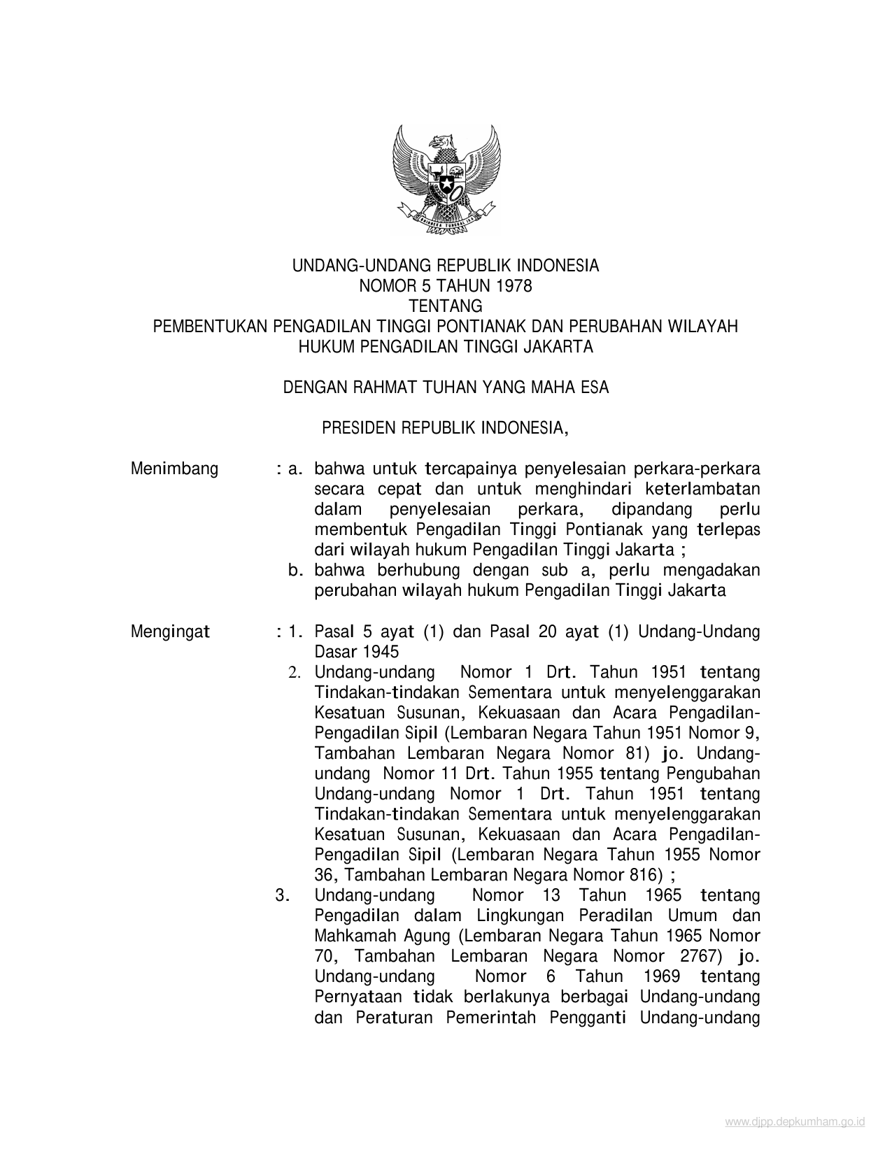 UU Nomor 5 Tahun 1978 | Undang-Undang Nomor 5 Tahun 1978 tentang PEMBENTUKAN PENGADILAN TINGGI PONTIANAK DAN PERUBAHAN WILAYAH HUKUM PENGADILAN TINGGI JAKARTA
