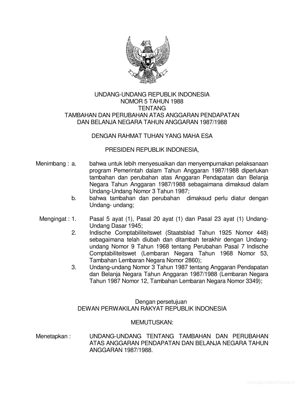 UU Nomor 5 Tahun 1988 | Undang-Undang Nomor 5 Tahun 1988 tentang TAMBAHAN DAN PERUBAHAN ANGGARAN PENDAPATAN DAN BELANJA NEGARA TAHUN ANGGARAN 1987/1988
