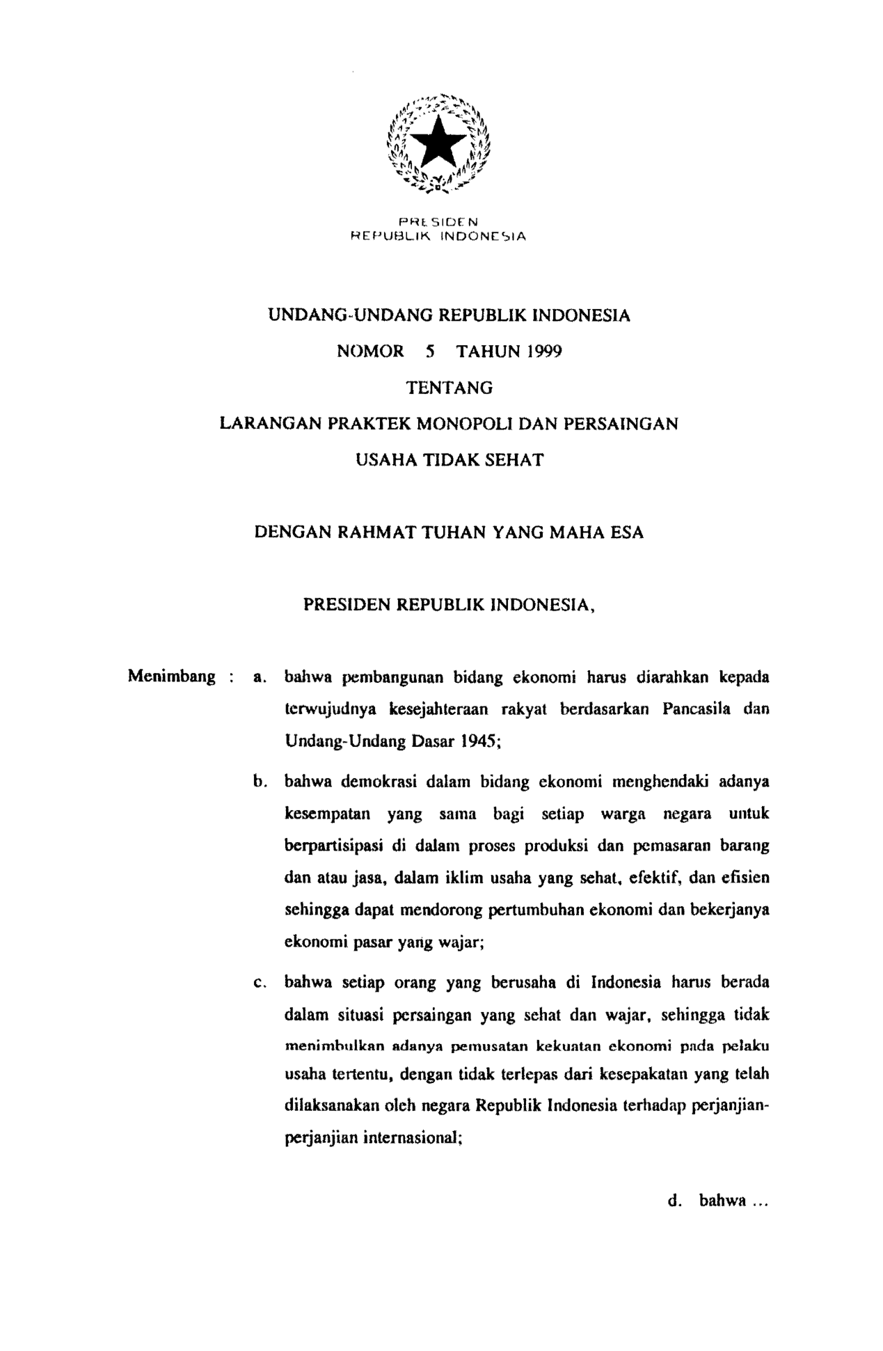 UU Nomor 5 Tahun 1999 | Undang-Undang Nomor 5 Tahun 1999 tentang LARANGAN PRAKTEK MONOPOLI DAN PERSAINGAN USAHA TIDAK SEHAT