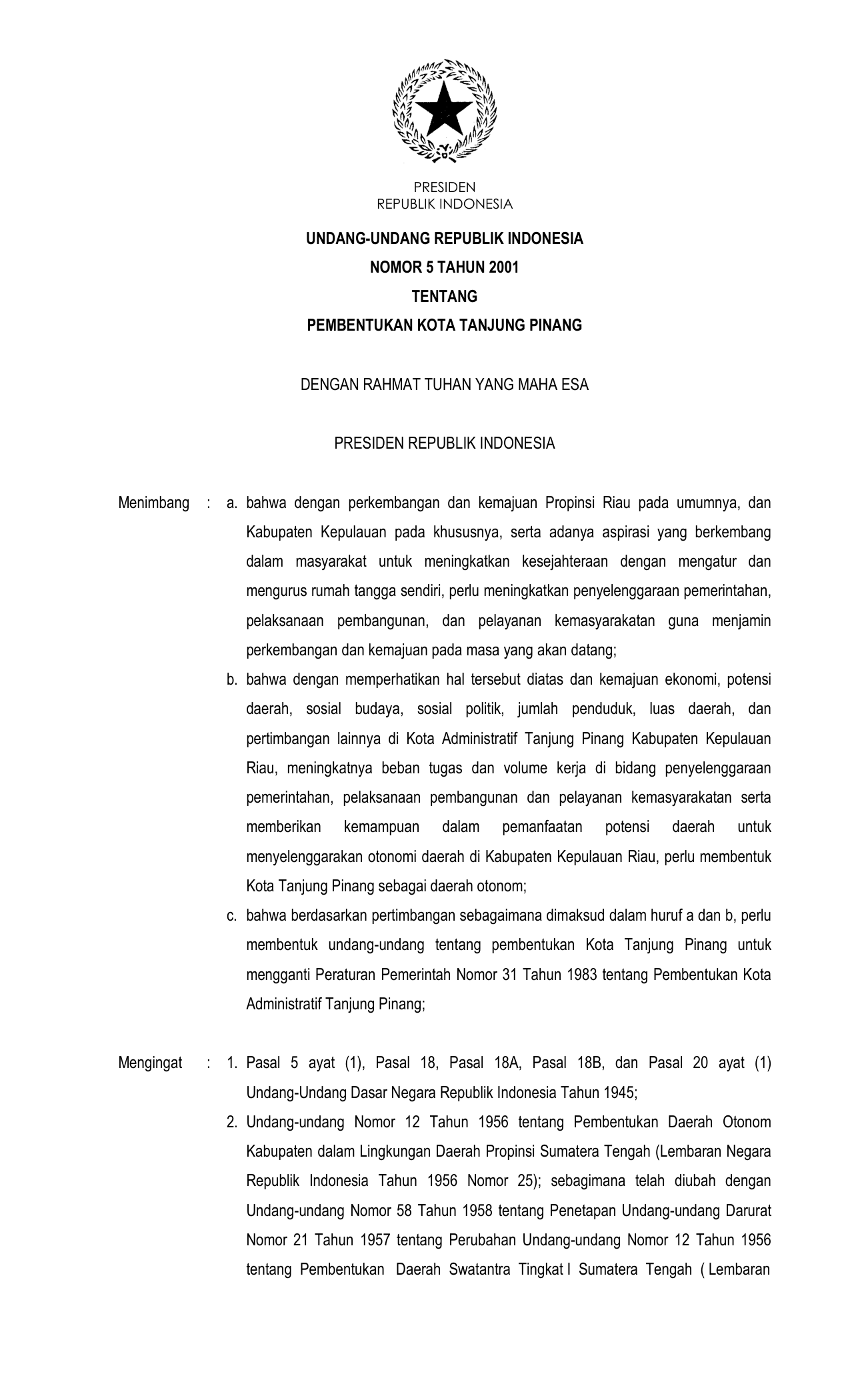 UU Nomor 5 Tahun 2001 | Undang-Undang Nomor 5 Tahun 2001 tentang PEMBENTUKAN KOTA TANJUNG PINANG