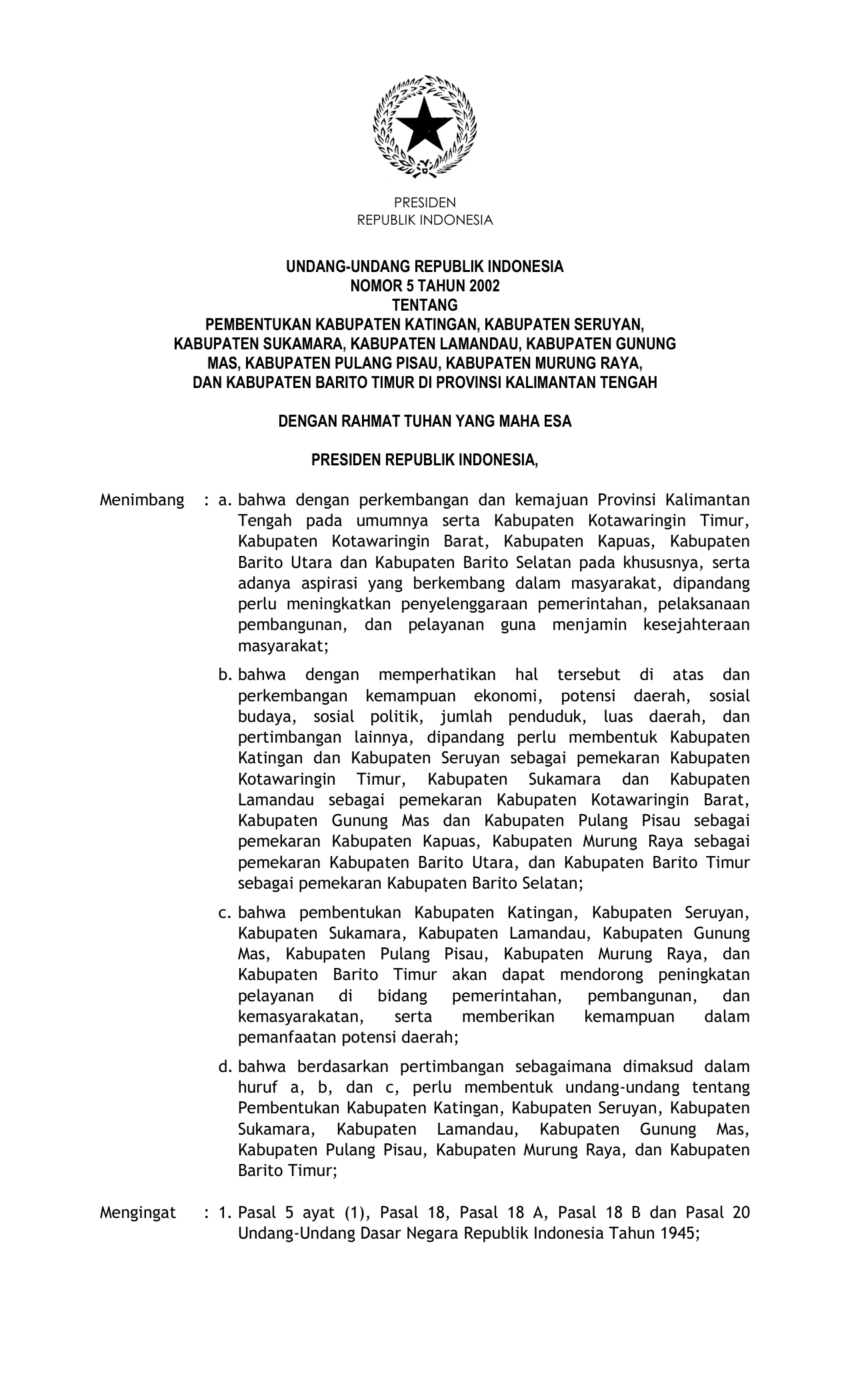 UU Nomor 5 Tahun 2002 | Undang-Undang Nomor 5 Tahun 2002 tentang PEMBENTUKAN KABUPATEN KATINGAN, KABUPATEN SERUYAN, KABUPATEN SUKAMARA, KABUPATEN LAMANDAU, KABUPATEN GUNUNG MAS, KABUPATEN PULAU PISANG, KABUPATEN MURUNG JAYA, DAN KABUPATEN BARITO TIMUR DI PROVINSI KALIMANTAN