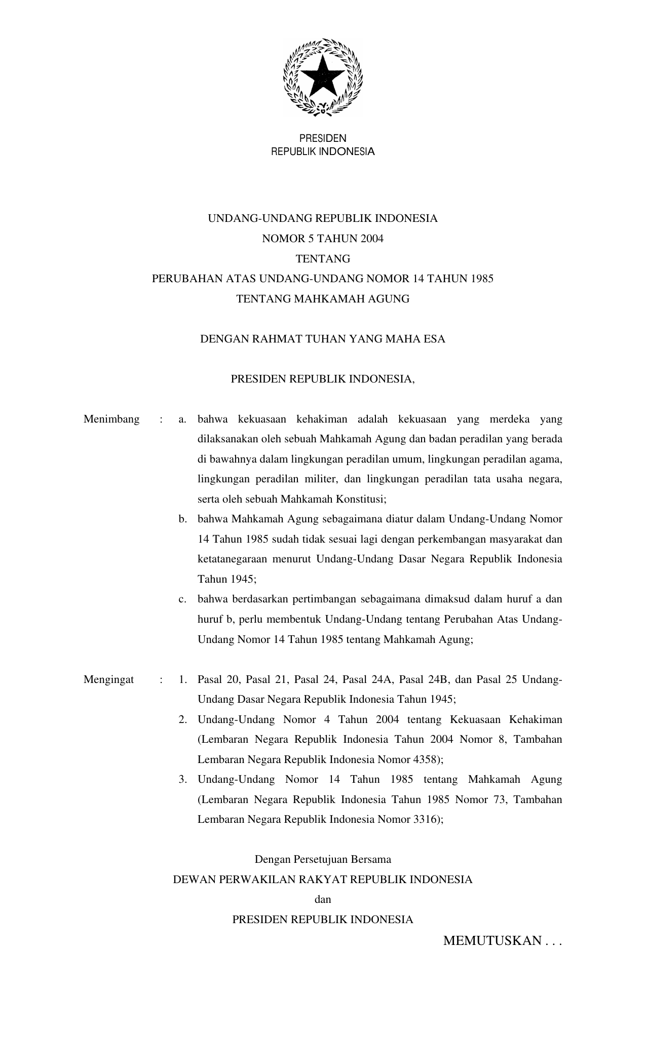 UU Nomor 5 Tahun 2004 | Undang-Undang Nomor 5 Tahun 2004 tentang PERUBAHAN UU 14-1985 TENTANG MAHKAMAH AGUNG