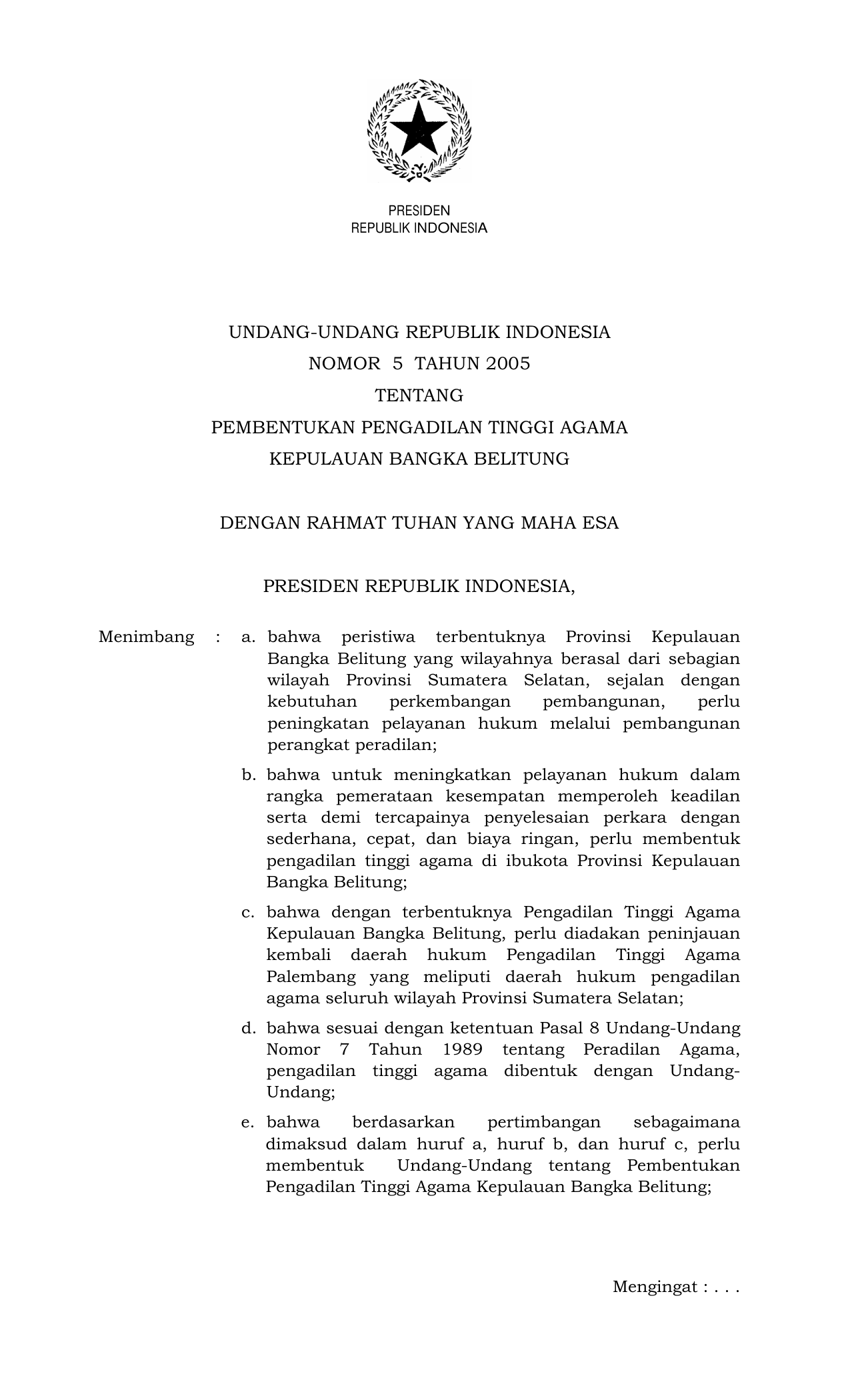 UU Nomor 5 Tahun 2005 | Undang-Undang Nomor 5 Tahun 2005 tentang PENGADILAN TINGGI AGAMA KEPULAUAN BANGKA BELITUNG