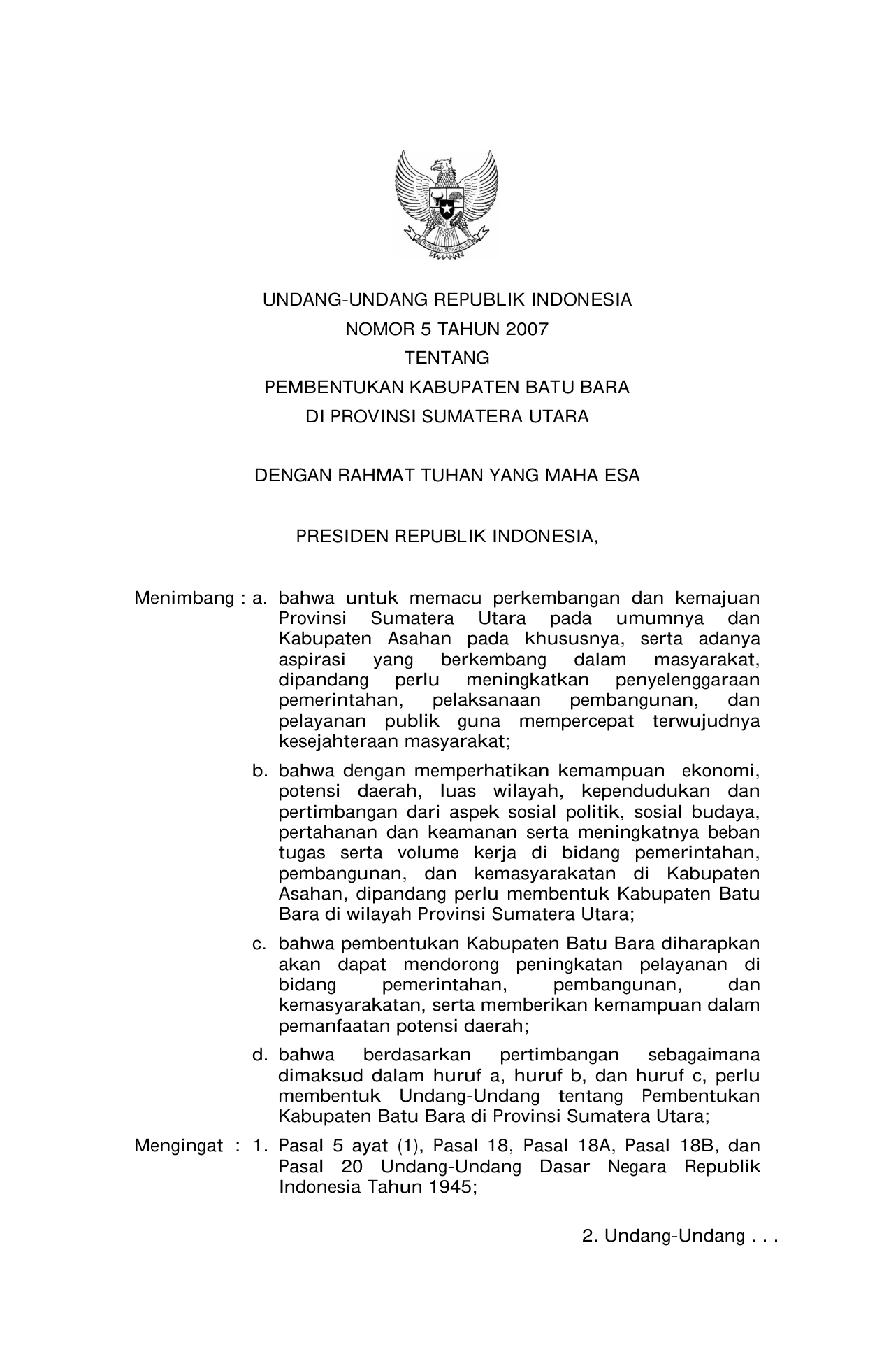 UU Nomor 5 Tahun 2007 | Undang-Undang Nomor 5 Tahun 2007 tentang PEMBENTUKAN KABUPATEN BATU BARA DI PROVINSI SUMATERA UTARA