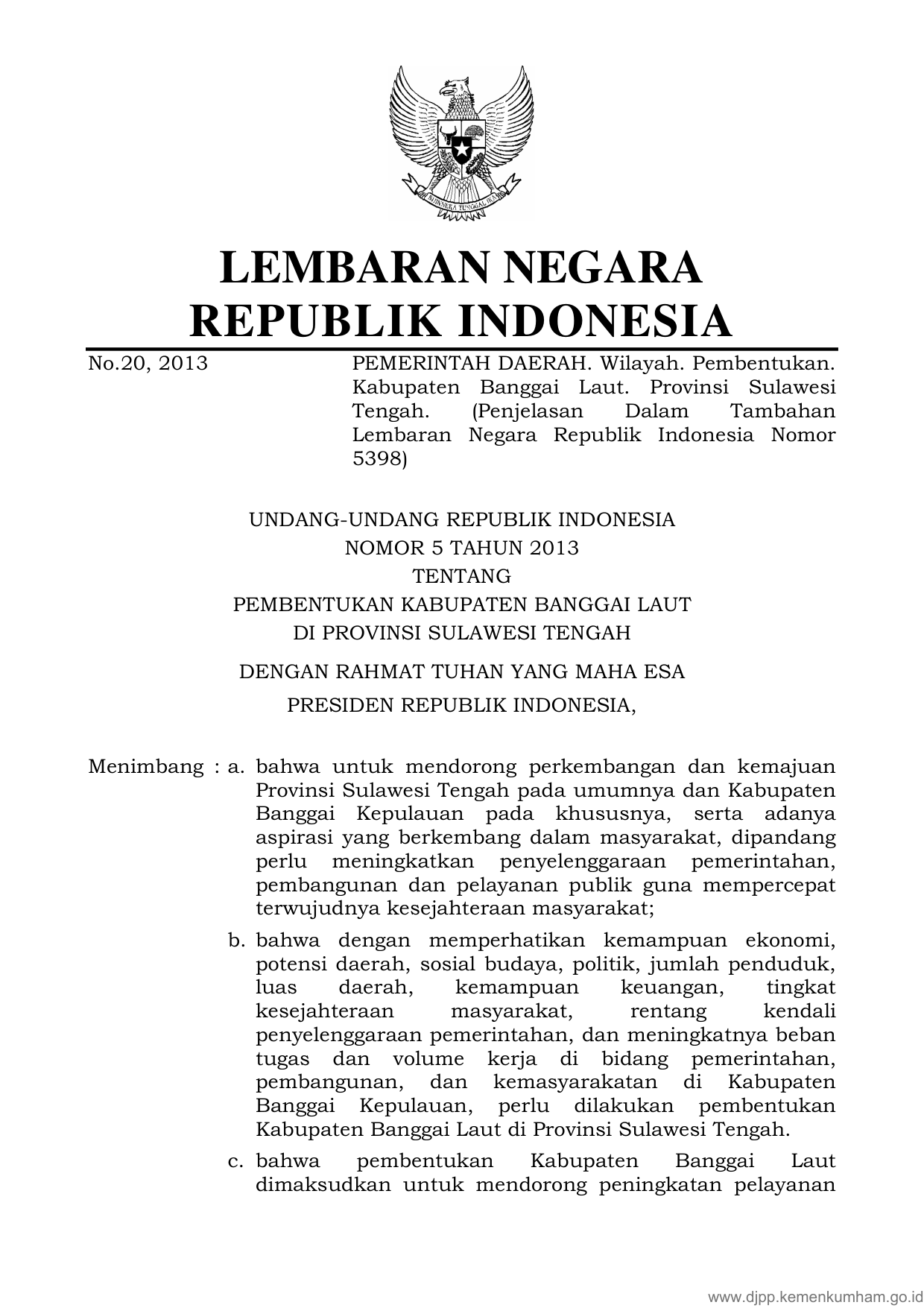 UU Nomor 5 Tahun 2013 | Undang-Undang Nomor 5 Tahun 2013 tentang PEMBENTUKAN KABUPATEN BANGGA LAUT DI PROVINSI SULAWESI TENGAH