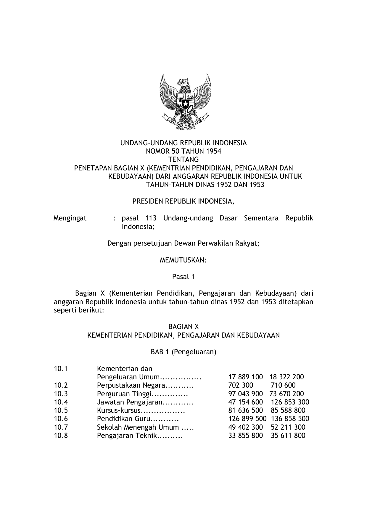UU Nomor 50 Tahun 1954 | Undang-Undang Nomor 50 Tahun 1954 tentang PENETAPAN BAGIAN X (KEMENTRIAN PENDIDIKAN, PENGAJARAN DAN KEBUDAYAAN) DARI ANGGARAN REPUBLIK INDONESIA UNTUK TAHUN-TAHUN DINAS 1952 DAN 1953