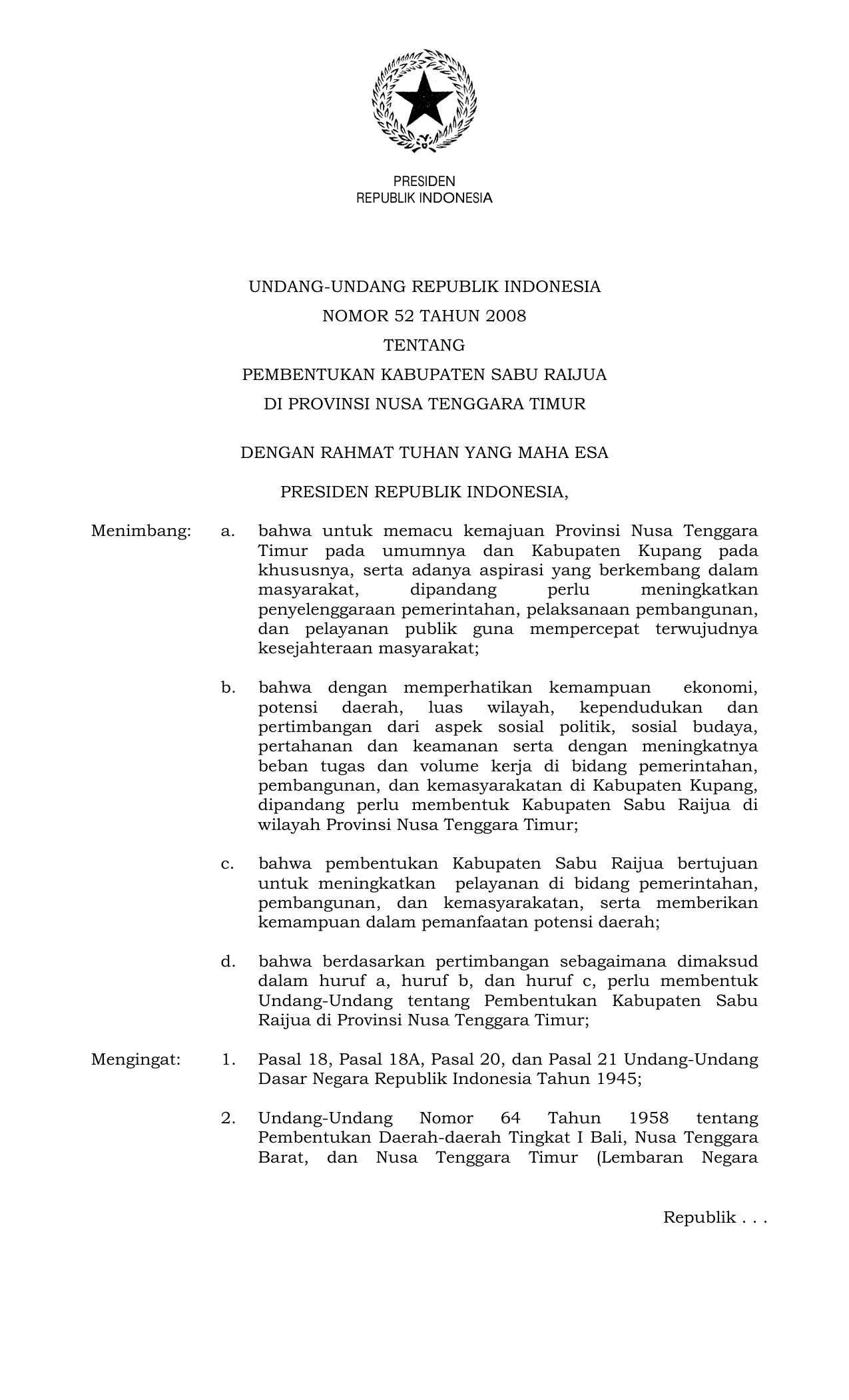 UU Nomor 52 Tahun 2008 | Undang-Undang Nomor 52 Tahun 2008 tentang PEMBENTUKAN KABUPATEN SABU RAIJUA DI PROVINSI NUSA TENGGARA TIMUR