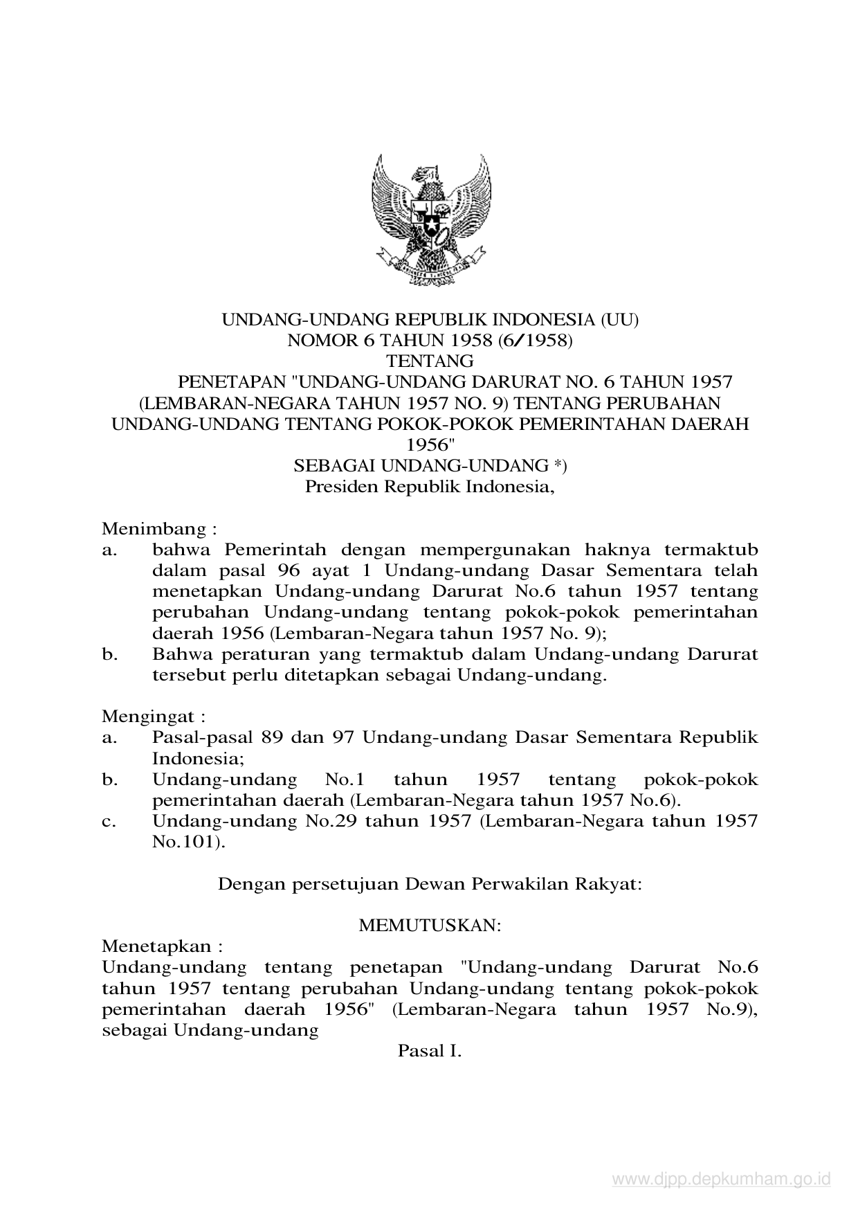 UU Nomor 6 Tahun 1958 | Undang-Undang Nomor 6 Tahun 1958 tentang PENETAPAN "UNDANG-UNDANG DARURAT NO.6 TAHUN 1957 (LEMBARAN-NEGARA TAHUN 1957 NO.9) TENTANG PERUBAHAN UNDANG-UNDANG TENTANG POKOK-POKOK PEMERINTAHAN DAERAH 1956" SEBAGAI UNDANG-UNDANG
