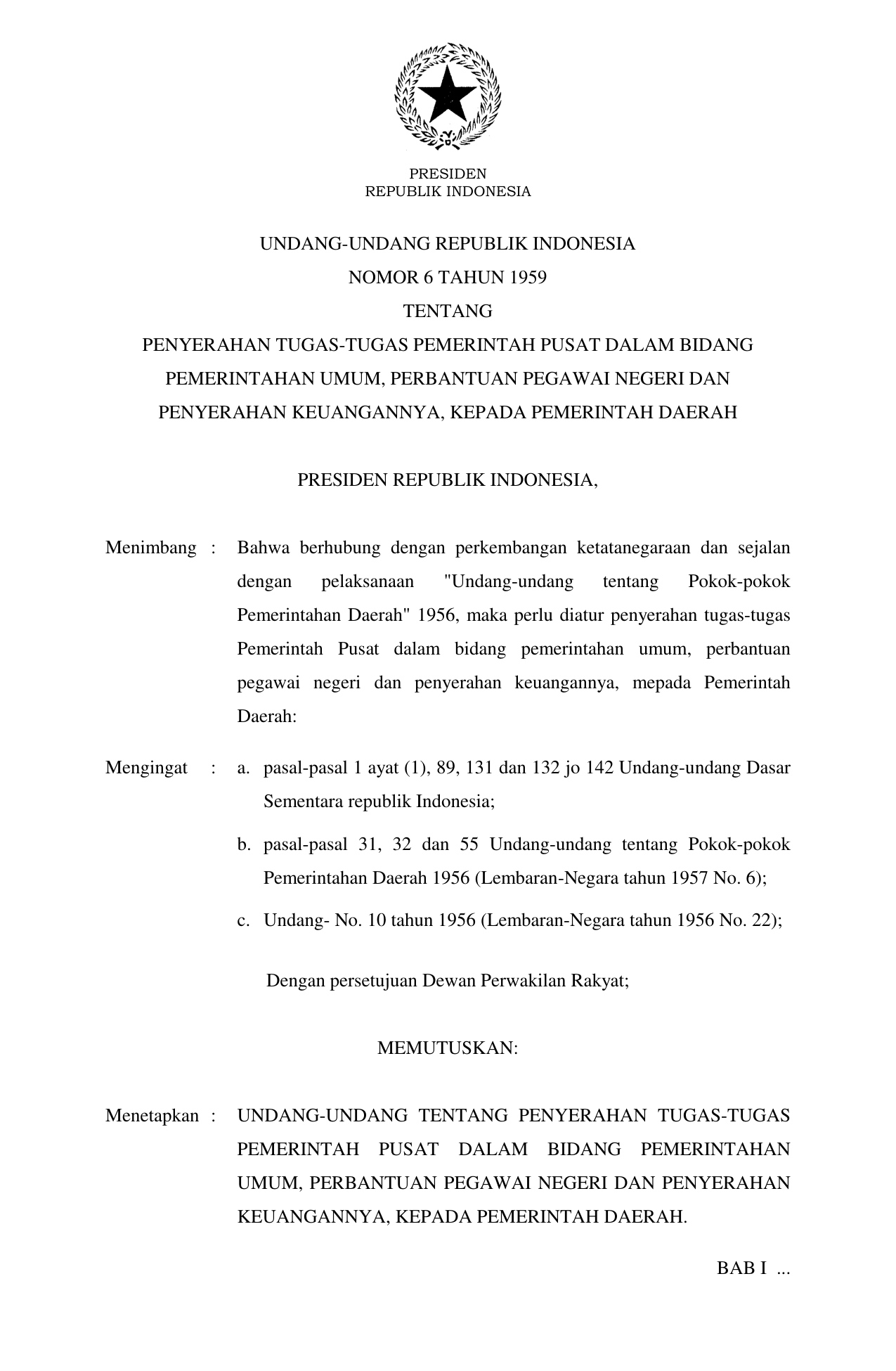 UU Nomor 6 Tahun 1959 | Undang-Undang Nomor 6 Tahun 1959 tentang PENYERAHAN TUGAS-TUGAS PEMERINTAH PUSAT DALAM BIDANG PEMERINTAHAN UMUM, PERBANTUAN PEGAWAI NEGERI DAN PENYERAHAN KEUANGANNYA, KEPADA PEMERINTAH DAERAH