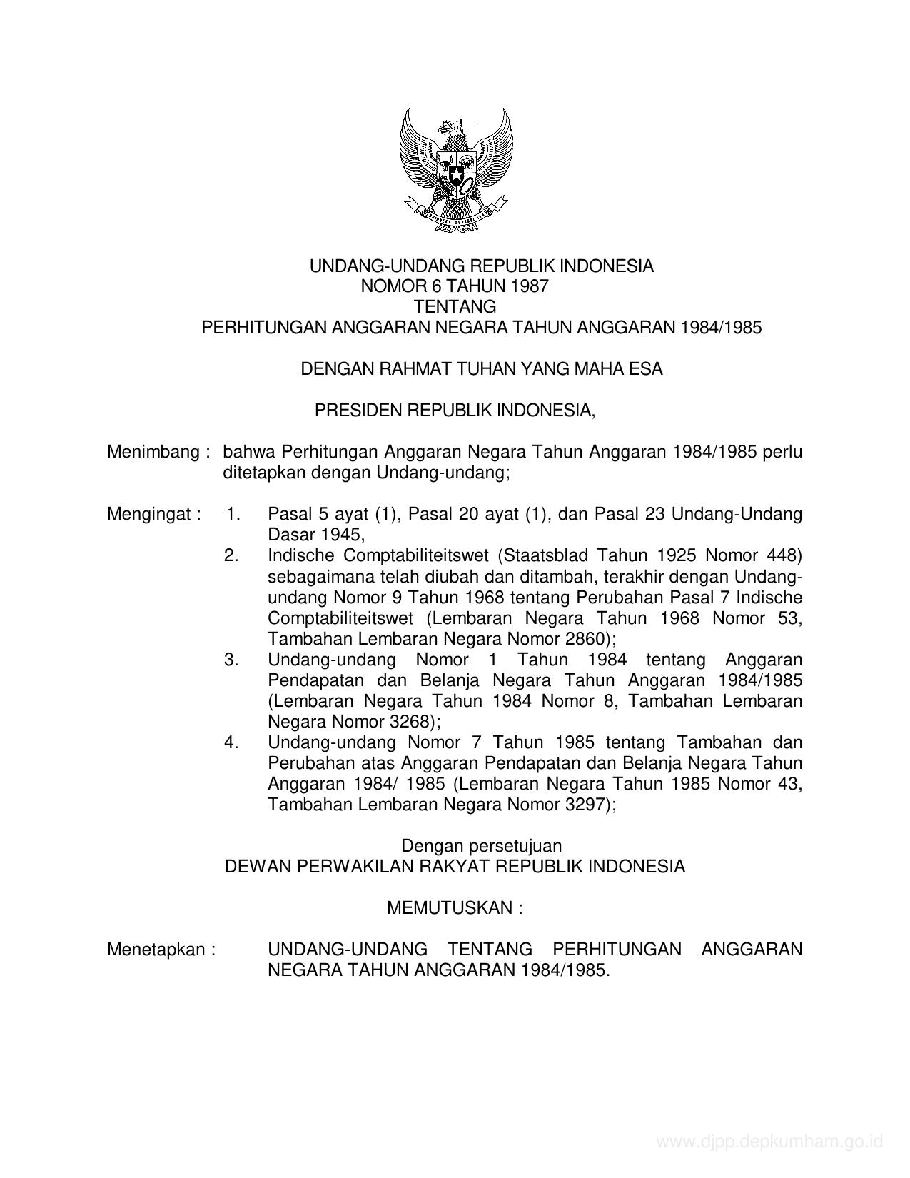 UU Nomor 6 Tahun 1987 | Undang-Undang Nomor 6 Tahun 1987 tentang PERHITUNGAN ANGGARAN NEGARA TAHUN ANGGARAN 1984/1985