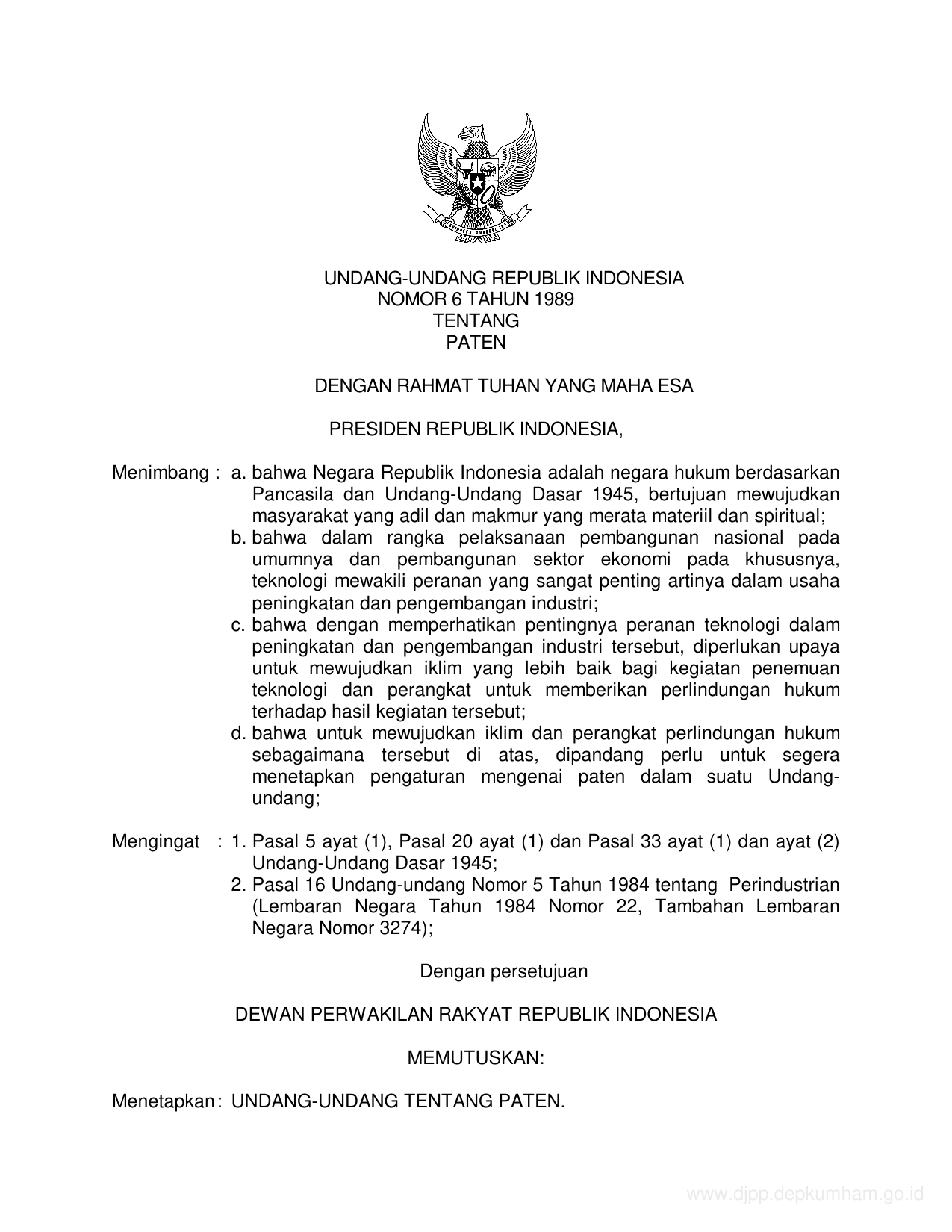 UU Nomor 6 Tahun 1989 | Undang-Undang Nomor 6 Tahun 1989 tentang PATEN